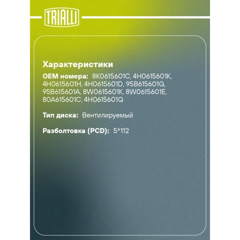 Диски тормозные для автомобилей Audi A4 (07-) / A5 (07-) / A6 (11-) / A7 (10-) / Q5 (08-) / Q7 (15-) / Porsche Macan (14-) задние d=330 Характеристики: Артикул: DF 180135 OEM номера: 8K0615601C, 4H0615601K, 4H0615601H, 4H0615601D, 95B615601G, 95B615601A, 8W0615601K, 8W0615601E, 80A615601C, 4H0615601Q Количество на автомобиль: 2 Сторона установки: Задняя ось Тип диска: Вентилируемый Гарантийный срок: 2 года / 60 000 км Диаметр внешний: 330 Диаметр центрирования: 68 Высота: 36 Толщина диска: 22 Мин. толщина диска: 20 Количество креп. отверстий: 5 Диаметр располож. креп. отверстий: 112 Разболтовка (PCD): 5*112 Сопутствующий товар: Колодки тормозные дисковые: PF 4405 Товарная линейка: BLACK Количество в коробке, шт.: 2 Подходит для авто: Audi A4 B8 (07-), A4 B8 (07-), A5 (07-), A5 (07-), A5 (07-), A6 C7 (11-), A7 (10-), Q5 (08-), A6 C7 (11-), A7 (10-), Q5 (08-), Q7 (15-) Porsche Macan (14-) Для проверки применяемости отправьте VIN автомобиля через вкладку "Есть вопросы о товаре?" Комплектация: Диск тормозной - 1 шт Гарантия: от 1 года.