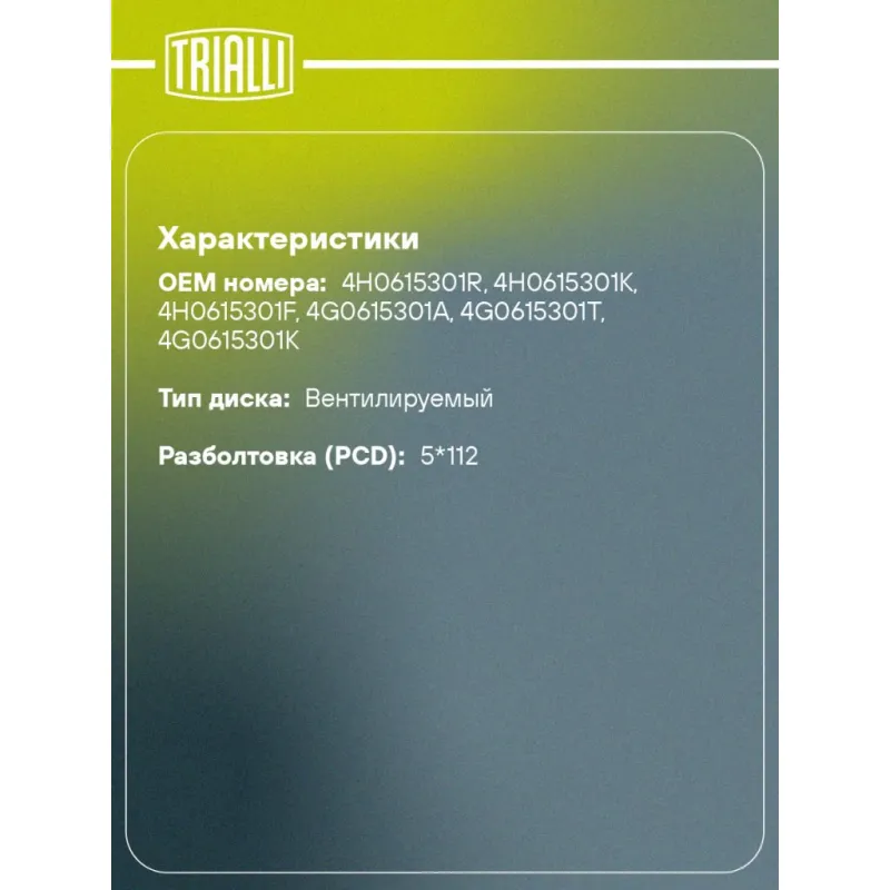 Диски тормозные для автомобилей Audi A6 (11-) / A7 (10-) / A8 (10-) передние d=356 Характеристики: Артикул: DF 185107 OEM номера: 4H0615301R, 4H0615301K, 4H0615301F, 4G0615301A, 4G0615301T, 4G0615301K Количество на автомобиль: 2 Сторона установки: Передняя ось Тип диска: Вентилируемый Гарантийный срок: 2 года / 60 000 км Диаметр внешний: 356 Диаметр центрирования: 68 Высота: 52.4 Толщина диска: 34 Мин. толщина диска: 31.5 Количество креп. отверстий: 5 Диаметр располож. креп. отверстий: 112 Разболтовка (PCD): 5*112 Товарная линейка: BLACK Количество в коробке, шт.: 1 Подходит для авто: Audi A6 C7 (11-), A7 (10-), A8 (10-), A6 C7 (11-), A7 (10-), A8 (10-) Для проверки применяемости отправьте VIN автомобиля через вкладку "Есть вопросы о товаре?" Комплектация: Диск тормозной - 1 шт Гарантия: от 1 года.