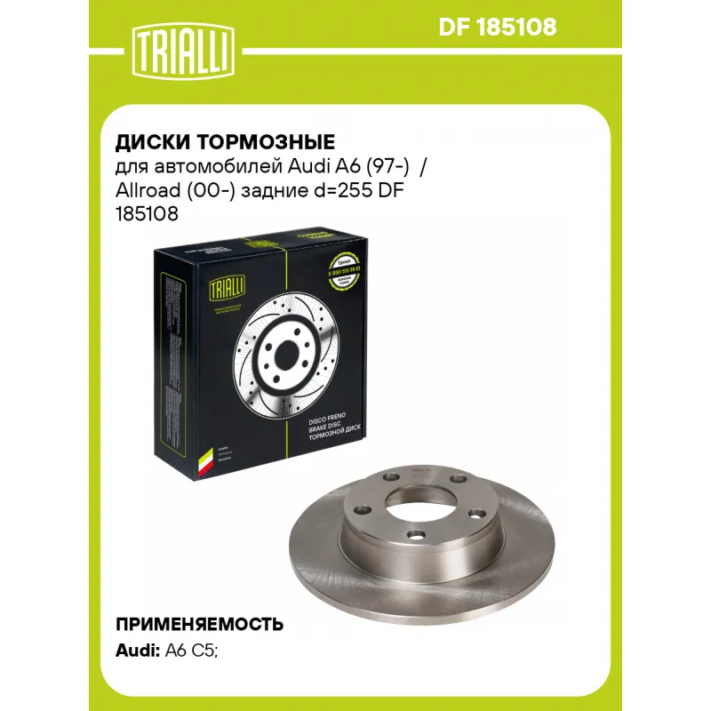 Диски тормозные для автомобилей Audi A6 (97-) / Allroad (00-) задние d=255 Характеристики: Артикул: DF 185108 OEM номера: 4B0615601B Количество на автомобиль: 2 Сторона установки: Задняя ось Тип диска: Полный Гарантийный срок: 2 года / 60 000 км Диаметр внешний: 255 Диаметр центрирования: 68 Высота: 48.1 Толщина диска: 10 Мин. толщина диска: 8 Количество креп. отверстий: 5 Диаметр располож. креп. отверстий: 112 Разболтовка (PCD): 5*112 Товарная линейка: BLACK Количество в коробке, шт.: 2 Подходит для авто: Audi A6 C5 (97-) Для проверки применяемости отправьте VIN автомобиля через вкладку "Есть вопросы о товаре?" Комплектация: Диск тормозной - 1 шт Гарантия: от 1 года.