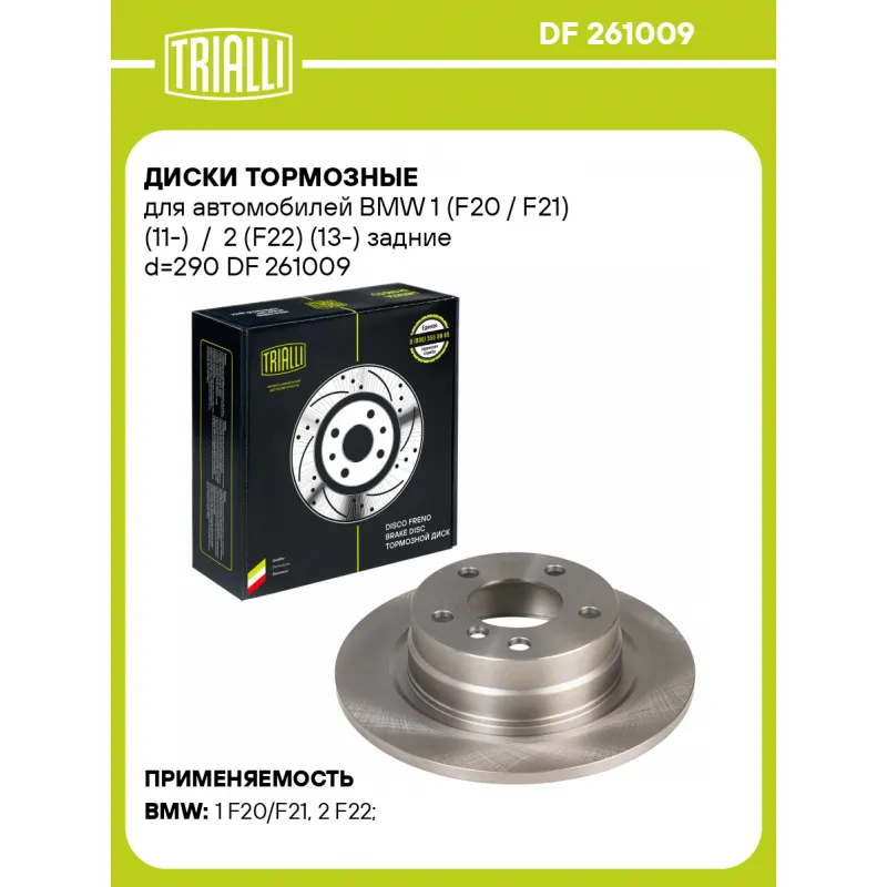 Диски тормозные для автомобилей BMW 1 (F20 / F21) (11-) / 2 (F22) (13-) задние d=290 Характеристики: Артикул: DF 261009 OEM номера: 34216792225 Количество на автомобиль: 2 Сторона установки: Задняя ось Тип диска: Полный Гарантийный срок: 2 года / 60 000 км Диаметр внешний: 290 Диаметр центрирования: 75 Высота: 66 Толщина диска: 11 Мин. толщина диска: 9.4 Количество креп. отверстий: 5 Диаметр располож. креп. отверстий: 120 Разболтовка (PCD): 5*120 Товарная линейка: BLACK Количество в коробке, шт.: 2 Подходит для авто: BMW 1 F20/F21 (11-), 1 F20/F21 (11-), 2 F22 (13-), 1 F20/F21 (11-), 1 F20/F21 (11-) Для проверки применяемости отправьте VIN автомобиля через вкладку "Есть вопросы о товаре?" Комплектация: Диск тормозной - 1 шт Гарантия: от 1 года.