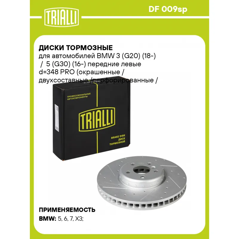 Диски тормозные для автомобилей BMW 3 (G20) (18-) / 5 (G30) (16-) передние левые d=348 PRO (окрашенные / двухсоставные /перфорированные / слотированные ) Характеристики: Артикул: DF 009sp OEM номера: 34116860911, 34108858705, 34106880075, 43516WAA01 Особенности конструкции:: Двухсоставной Тип диска: Вентилируемый Диаметр внешний: 348 Диаметр центрирования: 67 Высота: 66.1 Толщина диска: 36 Мин. толщина диска: 34.4 Количество креп. отверстий: 5 Диаметр располож. креп. отверстий: 112 Разболтовка (PCD): 5*112 Гарантийный срок: 2 года / 60 000 км Сторона установки: Передняя ось слева Сопутствующий товар: Колодки тормозные дисковые: PF 4217 Количество в коробке, шт.: 1 Финишное покрытие: E-Coating (глянцевый черный цвет) Парный товар: DF 008sp Количество на автомобиль: 1 Товарная линейка: BLACK Комплектация: Диск тормозной - 1 шт Гарантия: от 1 года.
