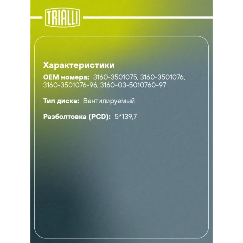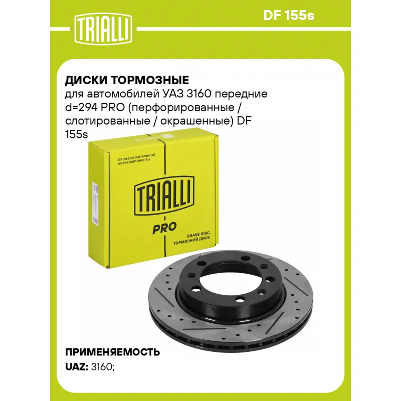 Диски тормозные для автомобилей УАЗ 3160 передние d=294 PRO (перфорированные / слотированные / окрашенные) Характеристики: Артикул: DF 155s OEM номера: 3160-3501075, 3160-3501076, 3160-3501076-96, 3160-03-5010760-97 Гарантийный срок: 2 года / 60 000 км Количество на автомобиль: 2 Сопутствующие товары:: DF 360, DF 460, BF 160, PF 968 Сторона установки: Передняя ось Тип диска: Вентилируемый Диаметр внешний: 294 Диаметр центрирования: 110 Высота: 54 Толщина диска: 23 Мин. толщина диска: 21 Количество креп. отверстий: 5 Диаметр располож. креп. отверстий: 139.7 Разболтовка (PCD): 5*139,7 Товарная линейка: BLACK Количество в коробке, шт.: 2 Комплектация: Диск тормозной - 1 шт Гарантия: от 1 года.
