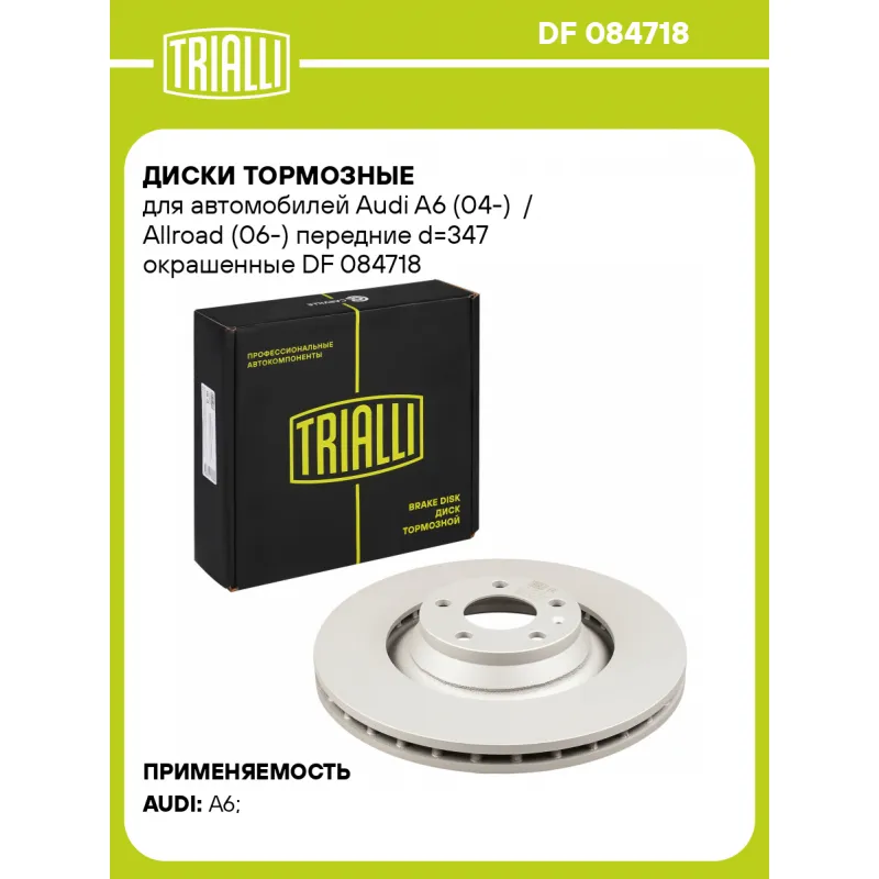 Диски тормозные для автомобилей Audi A6 (04-) / Allroad (06-) передние d=347 окрашенные Характеристики: Артикул: DF 084718 OEM номера: 4F0615301G, 4F0615301F Гарантийный срок: 2 года / 60 000 км Количество на автомобиль: 2 Сторона установки: Передняя ось Тип диска: Вентилируемый Диаметр внешний: 347 Диаметр центрирования: 68 Высота: 59.4 Толщина диска: 30 Мин. толщина диска: 28 Количество креп. отверстий: 5 Диаметр располож. креп. отверстий: 112 Разболтовка (PCD): 5*112 Товарная линейка: BLACK Количество в коробке, шт.: 1 Финишное покрытие: Geomet (матовый серебристый цвет) Комплектация: Диск тормозной - 1 шт Гарантия: от 1 года.