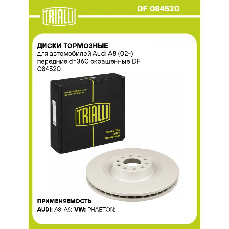Диски тормозные для автомобилей Audi A8 (02-) передние d=360 окрашенные Характеристики: Артикул: DF 084520 OEM номера: 4E0615301A, 4E0615301P, 4E0615301G, 3D0615301F, 4E0615301T, 4E0615301J Гарантийный срок: 2 года / 60 000 км Количество на автомобиль: 2 Сторона установки: Передняя ось Тип диска: Вентилируемый Диаметр внешний: 360 Диаметр центрирования: 68 Высота: 59.4 Толщина диска: 34 Мин. толщина диска: 31 Количество креп. отверстий: 5 Диаметр располож. креп. отверстий: 112 Разболтовка (PCD): 5*112 Товарная линейка: BLACK Количество в коробке, шт.: 1 Финишное покрытие: Geomet (матовый серебристый цвет) Комплектация: Диск тормозной - 1 шт Гарантия: от 1 года.
