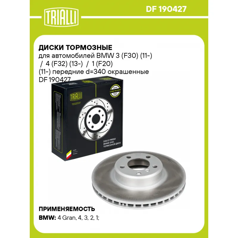 Диски тормозные для автомобилей BMW 3 (F30) (11-) / 4 (F32) (13-) / 1 (F20) (11-) передние d=340 окрашенные Характеристики: Артикул: DF 190427 OEM номера: 34116792223 Гарантийный срок: 2 года / 60 000 км Количество на автомобиль: 2 Сторона установки: Передняя ось Тип диска: Вентилируемый Диаметр внешний: 340 Диаметр центрирования: 79 Высота: 73.2 Толщина диска: 30 Мин. толщина диска: 28.4 Количество креп. отверстий: 5 Диаметр располож. креп. отверстий: 120 Разболтовка (PCD): 5*120 Товарная линейка: BLACK Количество в коробке, шт.: 1 Финишное покрытие: Geomet (матовый серебристый цвет) Комплектация: Диск тормозной - 1 шт Гарантия: от 1 года.