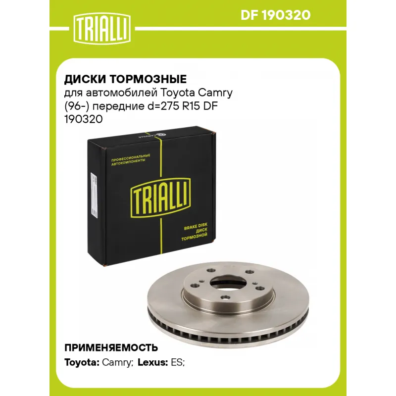 Диски тормозные для автомобилей Toyota Camry (96-) передние d=275 R15 Характеристики: Артикул: DF 190320 OEM номера: 4351233080, 4351233060, 4351233040, 435120603, 43512 06031, 43512 07020, 43512 33041, 43512 33042, 43512 33043, 43512 44011, 43512 33060, 43512 33040 Количество на автомобиль: 2 Сторона установки: Передняя ось Тип диска: Вентилируемый Гарантийный срок: 2 года / 60 000 км Диаметр внешний: 275 Диаметр центрирования: 62 Высота: 49.2 Толщина диска: 28 Мин. толщина диска: 26 Количество креп. отверстий: 5 Диаметр располож. креп. отверстий: 114.3 Разболтовка (PCD): 5*114,3 Сопутствующий товар: Колодки тормозные дисковые: PF 1910; PF 1912; PF 1920; PF 4103; PF 4343; PF 4347; PF 4348 Товарная линейка: BLACK Количество в коробке, шт.: 2 Сопутствующий товар: Диски тормозные: DF 190303; DF 190322 Подходит для авто: Toyota Camry (96-) Lexus ES (91-) Для проверки применяемости отправьте VIN автомобиля через вкладку "Есть вопросы о товаре?" Комплектация: Диск тормозной - 1 шт Гарантия: от 1 года.