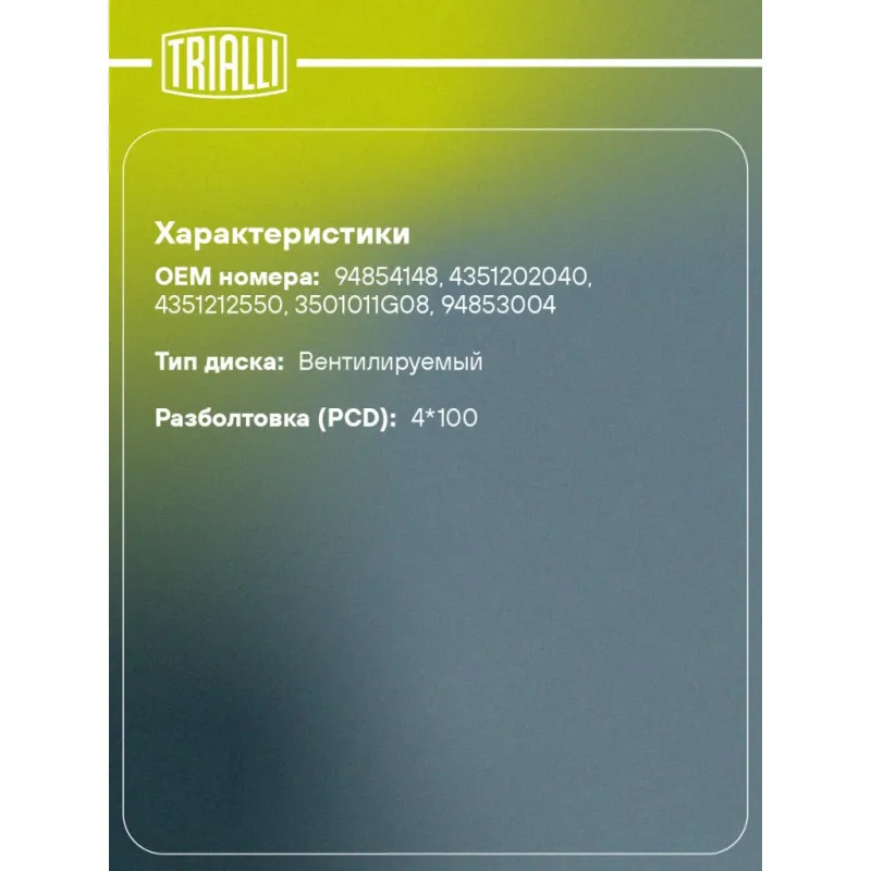Диски тормозные для автомобилей Toyota Corolla (97-) передние d=255 Характеристики: Артикул: DF 190103 OEM номера: 94854148, 4351202040, 4351212550, 3501011G08, 94853004 Гарантийный срок: 2 года / 60 000 км Количество на автомобиль: 2 Сторона установки: Передняя ось Тип диска: Вентилируемый Диаметр внешний: 255 Диаметр центрирования: 55 Высота: 48.1 Толщина диска: 22 Мин. толщина диска: 20 Количество креп. отверстий: 4 Диаметр располож. креп. отверстий: 100 Разболтовка (PCD): 4*100 Сопутствующий товар: Колодки тормозные дисковые: PF 1931 Товарная линейка: BLACK Количество в коробке, шт.: 2 Комплектация: Диск тормозной - 1 шт Гарантия: от 1 года.