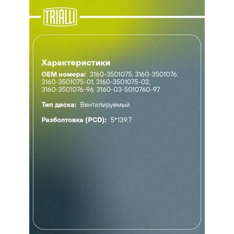 Диски тормозные для автомобилей УАЗ 3160 передние d=294 перфорированные Характеристики: Артикул: DF 460 OEM номера: 3160-3501075, 3160-3501076, 3160-3501075-01, 3160-3501075-02, 3160-3501076-96, 3160-03-5010760-97 Гарантийный срок: 2 года / 60 000 км Количество на автомобиль: 2 Сопутствующие товары:: DF 360, DF 460, BF 160, PF 968 Сторона установки: Передняя ось Особенности конструкции:: с перфорацией Тип диска: Вентилируемый Диаметр внешний: 294 Диаметр центрирования: 110 Высота: 54 Толщина диска: 23 Мин. толщина диска: 21 Количество креп. отверстий: 5 Диаметр располож. креп. отверстий: 139.7 Разболтовка (PCD): 5*139,7 Сопутствующий товар: Колодки тормозные дисковые: PF968 Товарная линейка: BLACK Количество в коробке, шт.: 2 Подходит для авто: УАЗ 3160 (97-), 3160 (97-), 3162 (00-), Patriot (97-), Patriot (08-), 31519, Hunter (УАЗ-315195) (03-), 3160 (97-), 3162 (00-), 3162 (00-), 3163 (Patriot) (05-), 31631, Patriot (97-), Patriot (97-), Patriot (08-), 315195, Hunter (УАЗ-315195) (03-), Hunter (УАЗ-315195) (03-) Для проверки применяемости отправьте VIN автомобиля через вкладку "Есть вопросы о товаре?" Комплектация: Диск тормозной - 1 шт Гарантия: от 1 года.