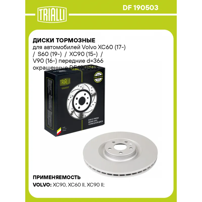 Диски тормозные для автомобилей Volvo XC60 (17-) / S60 (19-) / XC90 (15-) / V90 (16-) передние d=366 окрашенные Характеристики: Артикул: DF 190503 OEM номера: 31400569 Количество на автомобиль: 2 Сторона установки: Передняя ось Особенности конструкции:: С окрашенной ступичной частью Тип диска: Вентилируемый Гарантийный срок: 2 года / 60 000 км Диаметр внешний: 366 Диаметр центрирования: 63.6 Высота: 48 Толщина диска: 30 Мин. толщина диска: 27.5 Количество креп. отверстий: 5 Диаметр располож. креп. отверстий: 108 Разболтовка (PCD): 5*108 Сопутствующий товар: Колодки тормозные дисковые: PF 4345 Товарная линейка: BLACK Количество в коробке, шт.: 1 Финишное покрытие: Geomet (матовый серебристый цвет) Комплектация: Диск тормозной - 1 шт Гарантия: от 1 года.