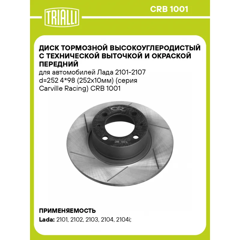 Диск тормозной высокоуглеродистый с технической выточкой и окраской передний для автомобилей Лада 2101-2107 d=252 4*98 (252х10мм) (серия Carville Racing) Характеристики: Артикул: CRB 1001 OEM номера: 2101-3501070, 2101-3501070-01, 21010-3501070-01, 2101-3501070-00, 21010-3501070, 21010-3501070-00 Ось (сторона установки): передняя ось Тип диска: полный Диаметр внешний: 252,2 Диаметр центрирования: 68 Высота: 65 Толщина диска: 10 Мин. толщина диска: 9 Количество креп. отверстий: 4 Диаметр располож. креп. отверстий: 98 Диаметр креп. отверстий: 13.2 Разболтовка (PCD): 98*4 Особенности конструкции:: окраска, шлифовка, слотирование Гарантийный срок: 1 год / 60 000 км Подходит для авто: ВАЗ 2101, 2101, 2101, 2102, 2102, 2102, 2103, 2103, 2104, 2104, 2104i, 2104, 2105, 2105, 2105i, 2105, 21053, 21061, 21065, 2107i, 21073, 2107, 2107, 2107, 2107, 2106, 2106, 2106, 2106, 2104, 2105, 21053, 21073, 2107 Для проверки применяемости отправьте VIN автомобиля через вкладку "Есть вопросы о товаре?" Комплектация: Диск тормозной - 1 шт Гарантия: от 1 года.