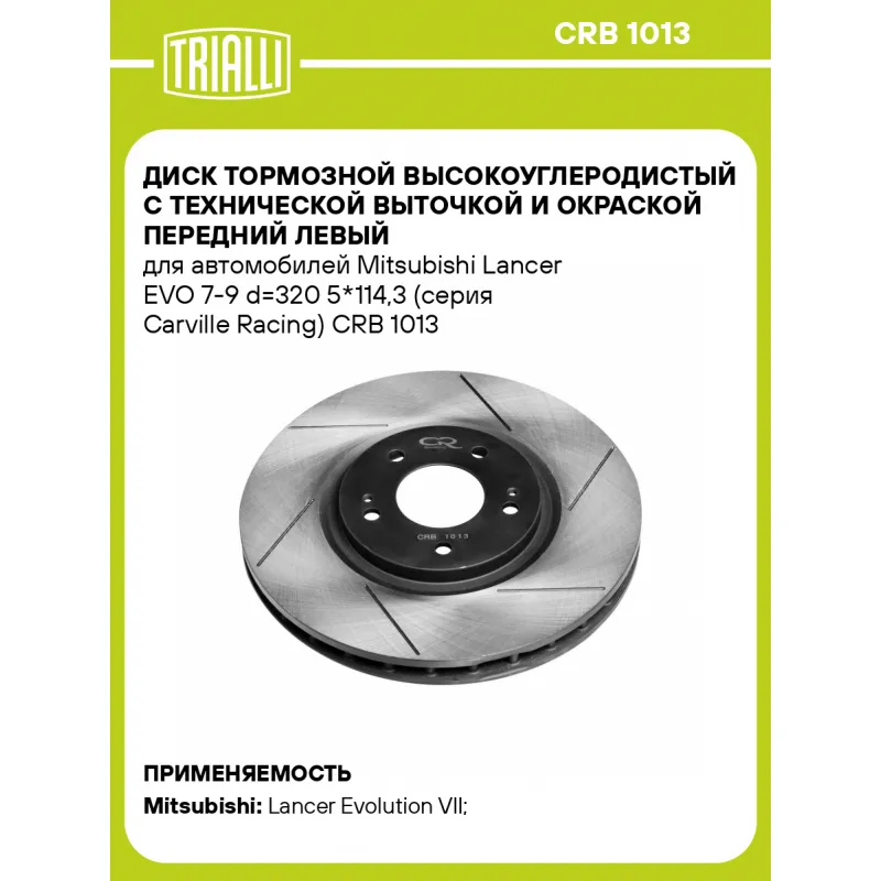 Диск тормозной высокоуглеродистый с технической выточкой и окраской передний левый для автомобилей Mitsubishi Lancer EVO 7-9 d=320 5*114,3 (серия Carville Racing) Характеристики: Артикул: CRB 1013 OEM номера: 4615A031, MR493993, MR370723 Ось (сторона установки): передняя ось Тип диска: вентилируемый Диаметр внешний: 320 Диаметр центрирования: 69 Высота: 43,5 Толщина диска: 32 Мин. толщина диска: 29,8 Количество креп. отверстий: 5 Диаметр располож. креп. отверстий: 114.3 Диаметр креп. отверстий: 12,5 Разболтовка (PCD): 114,3*5 Особенности конструкции:: окраска, шлифовка, слотирование Гарантийный срок: 1 год / 60 000 км Подходит для авто: Mitsubishi Lancer Evolution VII (01-), Lancer Evolution VIII (03-), Lancer Evolution IX (05-) Для проверки применяемости отправьте VIN автомобиля через вкладку "Есть вопросы о товаре?" Комплектация: Диск тормозной - 1 шт Гарантия: от 1 года.