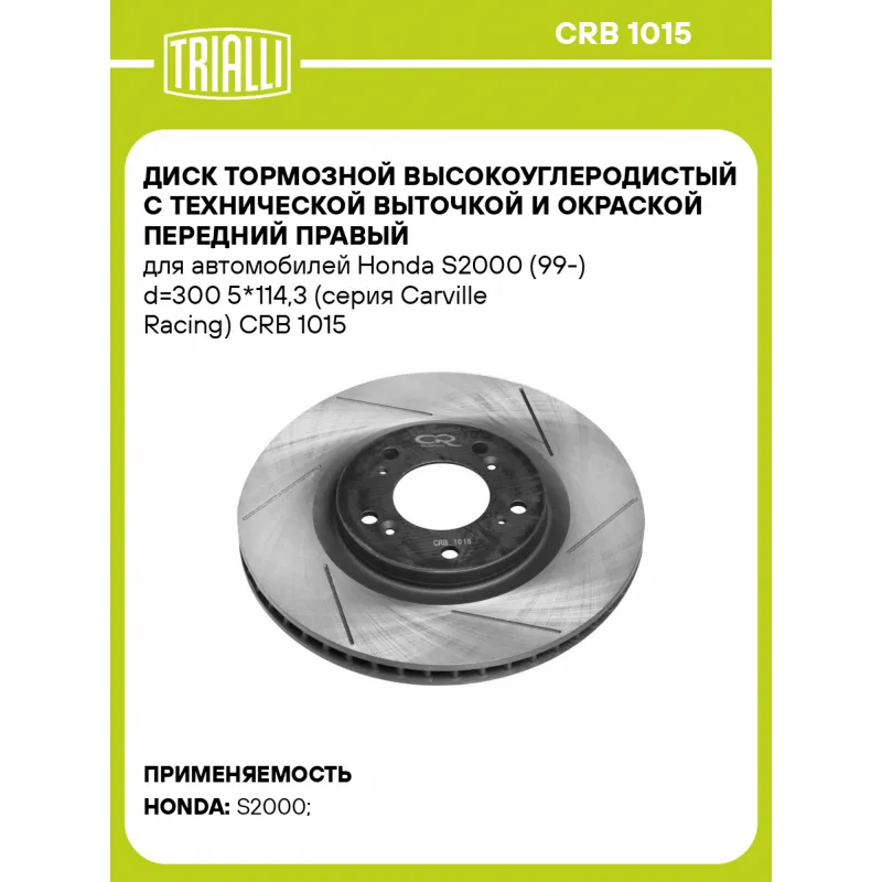 Диск тормозной высокоуглеродистый с технической выточкой и окраской передний правый для автомобилей Honda S2000 (99-) d=300 5*114,3 (серия Carville Racing) Характеристики: Артикул: CRB 1015 OEM номера: 45251S2A000 Ось (сторона установки): передняя ось Тип диска: вентилируемый Диаметр внешний: 300 Диаметр центрирования: 64,1 Высота: 47,1 Толщина диска: 25 Мин. толщина диска: 23 Количество креп. отверстий: 5 Диаметр располож. креп. отверстий: 114.3 Диаметр креп. отверстий: 12,7 Разболтовка (PCD): 114,3*5 Особенности конструкции:: окраска, шлифовка, слотирование Гарантийный срок: 1 год / 60 000 км Комплектация: Диск тормозной - 1 шт Гарантия: от 1 года.
