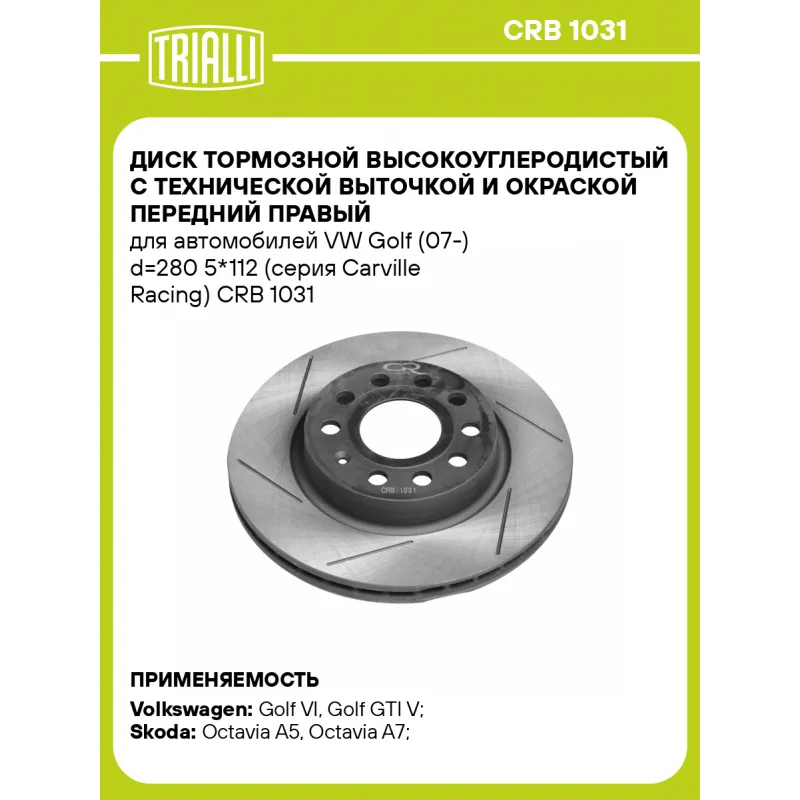 Диск тормозной высокоуглеродистый с технической выточкой и окраской передний правый для автомобилей VW Golf (07-) d=280 5*112 (серия Carville Racing) Характеристики: Артикул: CRB 1031 OEM номера: 1K0 615 301 AK, 1K0615301AC, 1K0615301S, 5C0615301, 1K0615301AQ, 1K0615301AS, JZW 615 301 A Ось (сторона установки): передняя ось Тип диска: вентилируемый Диаметр внешний: 280 Диаметр центрирования: 65 Высота: 42,4 Толщина диска: 22 Мин. толщина диска: 19,0 Количество креп. отверстий: 5 Диаметр располож. креп. отверстий: 112 Диаметр креп. отверстий: 15,3 Разболтовка (PCD): 112*5 Особенности конструкции:: окраска, шлифовка, слотирование Гарантийный срок: 1 год / 60 000 км Подходит для авто: Volkswagen Golf GTI V (04-), Jetta (05-), Jetta (11-), Golf GTI VI (09-), Caddy (04-), Beetle (10-), Golf VI (08-), Golf V (03-), Jetta (05-), Golf VII (12-) Skoda Octavia A5 (04-), Octavia A5 (04-), Octavia A7 (13-) Для проверки применяемости отправьте VIN автомобиля через вкладку "Есть вопросы о товаре?" Комплектация: Диск тормозной - 1 шт Гарантия: от 1 года.