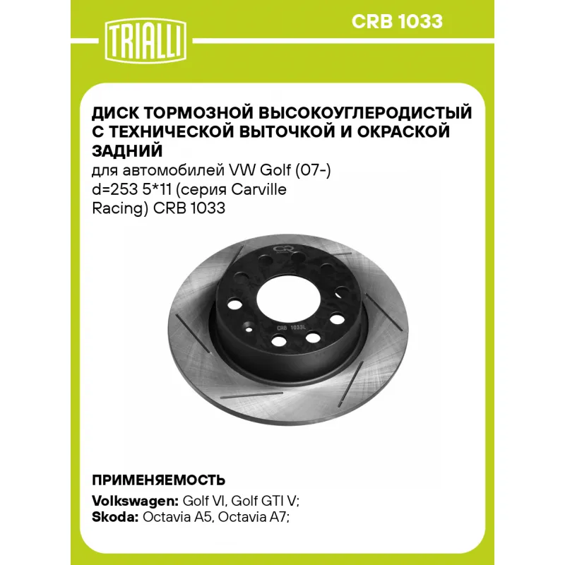 Диск тормозной высокоуглеродистый с технической выточкой и окраской задний для автомобилей VW Golf (07-) d=253 5*11 (серия Carville Racing) Характеристики: Артикул: CRB 1033 OEM номера: 5C0615601, 1K0 615 601 AB, 1K0615601K Ось (сторона установки): задняя ось Тип диска: вентилируемый Диаметр внешний: 253 Диаметр центрирования: 65 Высота: 51,6 Толщина диска: 10 Мин. толщина диска: 8 Количество креп. отверстий: 5 Диаметр располож. креп. отверстий: 112 Диаметр креп. отверстий: 15,3 Разболтовка (PCD): 112*5 Особенности конструкции:: окраска, шлифовка, слотирование Гарантийный срок: 1 год / 60 000 км Подходит для авто: Volkswagen Golf GTI V (04-), Jetta (05-), Jetta (11-), Golf GTI VI (09-), Caddy (04-), Beetle (10-), Scirocco (08-), Golf VI (08-), Golf V (03-), Jetta (05-), Golf VII (12-) Skoda Octavia A5 (04-), Octavia A5 (04-), Octavia A7 (13-) Для проверки применяемости отправьте VIN автомобиля через вкладку "Есть вопросы о товаре?" Комплектация: Диск тормозной - 1 шт Гарантия: от 1 года.