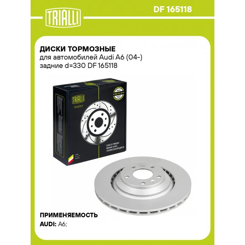Диски тормозные для автомобилей Audi A6 (04-) задние d=330 Характеристики: Артикул: DF 165118 OEM номера: 4F0615601F, 4F0615601D, L4FD615601A Гарантийный срок: 2 года / 60 000 км Количество на автомобиль: 2 Сторона установки: Задняя ось Тип диска: Вентилируемый Диаметр внешний: 330 Диаметр центрирования: 68 Высота: 49 Толщина диска: 22 Мин. толщина диска: 20 Количество креп. отверстий: 5 Диаметр располож. креп. отверстий: 112 Разболтовка (PCD): 5*112 Товарная линейка: BLACK Количество в коробке, шт.: 2 Комплектация: Диск тормозной - 1 шт Гарантия: от 1 года.