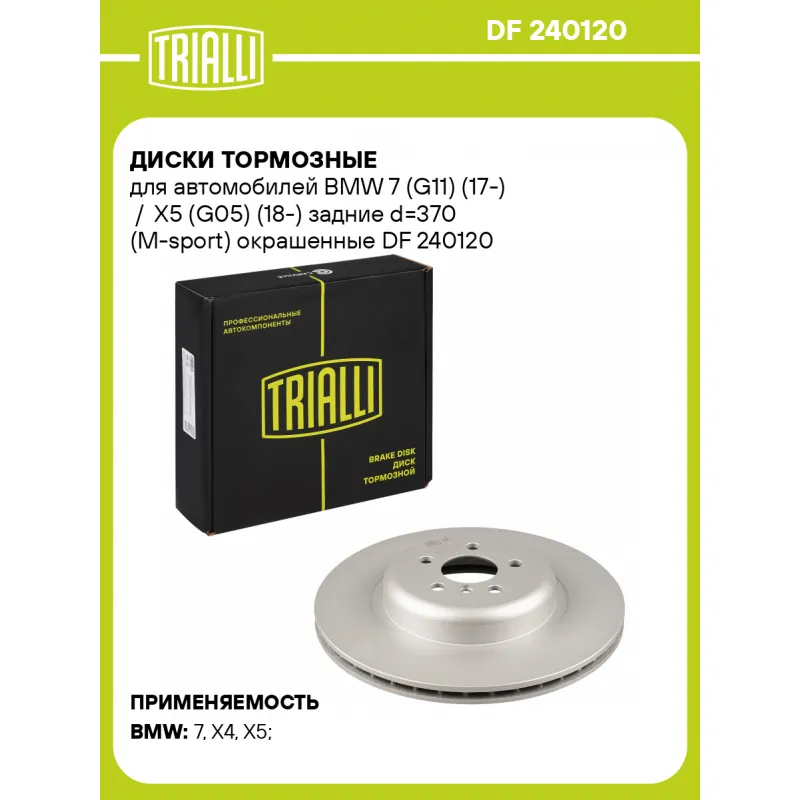 Диски тормозные для автомобилей BMW 7 (G11) (17-) / X5 (G05) (18-) задние d=370 (M-sport) окрашенные Характеристики: Артикул: DF 240120 OEM номера: 34216860927, 34206880080, 34206898494, 34206898493 Количество на автомобиль: 2 Сторона установки: Задняя ось Особенности конструкции:: Цельнолитой Тип диска: Вентилируемый Гарантийный срок: 2 года / 60 000 км Диаметр внешний: 370 Диаметр центрирования: 67 Высота: 64 Толщина диска: 24 Мин. толщина диска: 22 Количество креп. отверстий: 5 Диаметр располож. креп. отверстий: 112 Разболтовка (PCD): 5*112 Товарная линейка: BLACK Количество в коробке, шт.: 1 Финишное покрытие: Geomet (матовый серебристый цвет) Комплектация: Диск тормозной - 1 шт Гарантия: от 1 года.