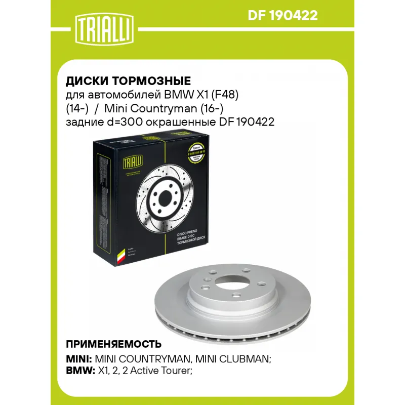 Диски тормозные для автомобилей BMW X1 (F48) (14-) / Mini Countryman (16-) задние d=300 окрашенные Характеристики: Артикул: DF 190422 OEM номера: 34216799369, 34206891086, 6799369 Гарантийный срок: 2 года / 60 000 км Количество на автомобиль: 2 Сторона установки: Задняя ось Тип диска: Вентилируемый Диаметр внешний: 300 Диаметр центрирования: 67 Высота: 49 Толщина диска: 20 Мин. толщина диска: 18.4 Количество креп. отверстий: 5 Диаметр располож. креп. отверстий: 112 Разболтовка (PCD): 5*112 Сопутствующий товар: Колодки тормозные дисковые: PF 4049 Товарная линейка: BLACK Количество в коробке, шт.: 2 Финишное покрытие: Geomet (матовый серебристый цвет) Комплектация: Диск тормозной - 1 шт Гарантия: от 1 года.