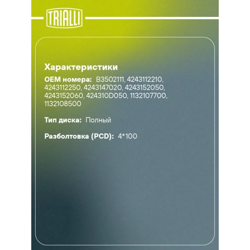 Диски тормозные для автомобилей Toyota Corolla (01-) / Lifan Solano (10-) / BYD F3 (05-) задние d=268 Характеристики: Артикул: DF 190222 OEM номера: B3502111, 4243112210, 4243112250, 4243147020, 4243152050, 4243152060, 424310D050, 1132107700, 1132108500 Гарантийный срок: 2 года / 60 000 км Количество на автомобиль: 2 Сторона установки: Задняя ось Тип диска: Полный Диаметр внешний: 268,9 Диаметр центрирования: 55.1 Высота: 55.2 Толщина диска: 9,3 Мин. толщина диска: 7.4 Количество креп. отверстий: 4 Диаметр располож. креп. отверстий: 100 Разболтовка (PCD): 4*100 Сопутствующий товар: Колодки тормозные дисковые: PF 1901; PF 1905; PF 1906; PF 4103; PF 4108; PF 4338 Сопутствующий товар: Суппорты тормозные: CF 182069 Товарная линейка: BLACK Количество в коробке, шт.: 2 Сопутствующий товар: Диски тормозные: DF 190104; DF 190121; DF 190201; DF 190206; DF 190221 Подходит для авто: Toyota Corolla E120 (01-), Corolla E120 (01-) Lifan Solano I (10-) Для проверки применяемости отправьте VIN автомобиля через вкладку "Есть вопросы о товаре?" Комплектация: Диск тормозной - 1 шт Гарантия: от 1 года.