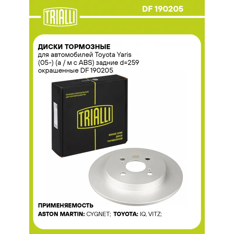 Диски тормозные для автомобилей Toyota Yaris (05-) (а / м c ABS) задние d=259 окрашенные Характеристики: Артикул: DF 190205 OEM номера: 4243152080, 424310D110 Гарантийный срок: 2 года / 60 000 км Количество на автомобиль: 2 Сторона установки: Задняя ось Тип диска: Полный Диаметр внешний: 259 Диаметр центрирования: 55 Высота: 30.4 Толщина диска: 9 Мин. толщина диска: 7.5 Количество креп. отверстий: 4 Диаметр располож. креп. отверстий: 100 Разболтовка (PCD): 4*100 Сопутствующий товар: Колодки тормозные дисковые: PF 4115 Товарная линейка: BLACK Финишное покрытие: Geomet (матовый серебристый цвет) Комплектация: Диск тормозной - 1 шт Гарантия: от 1 года.