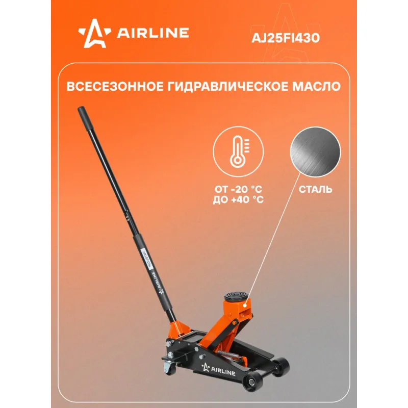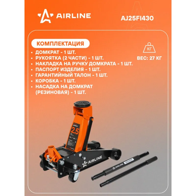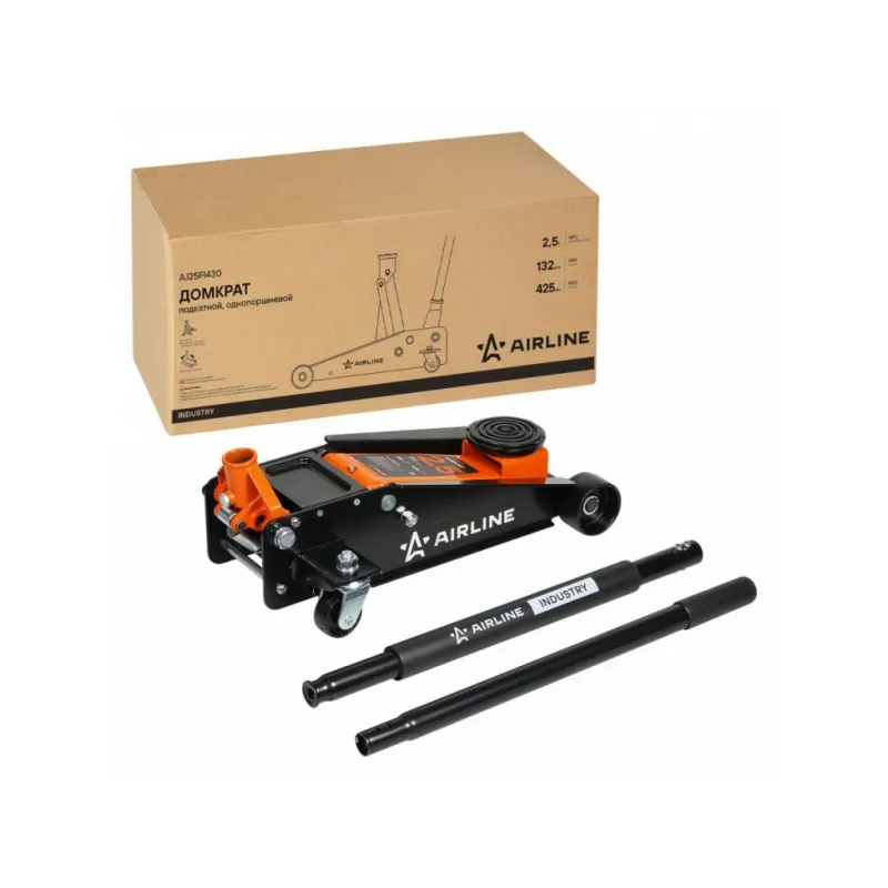 Домкрат подкатной 2.5т 132-425мм INDUSTRY однопоршневой Описание: Домкрат автомобильный подкатной гидравлический бренда AIRLINE- надежное устройство повышенной грузоподъемности подойдет для подъема грузов и мебели, легковых машин, внедорожников и кроссоверов до 2.5 т. Домкрат входит в линейку INDUSTRY. Предназначен для профессионального применения в автосервисах и шиномонтажных мастерских, а так же для личного использования. Грузоподъемность модели AJ25FI430 - 2.5 т. Домкрат подкатной позволяет поднять груз на высоту - 425 мм. Минимальная высота подхвата 132 мм. Особенности домкрата: высокая устойчивость, рукоятка, морозостойкость -40С, накладка на ручку домкрата, резиновая насадка на домкрат. 1. Запрещается превышать грузоподъемность домкрата! 2. Домкрат не должен использоваться в качестве подставки для поднятия грузов. 3. При подъеме груза убедитесь, что нагрузка приходится на центр опорной площадки. 4. Рекомендуется использовать страховочные подставки и противооткатные упоры. Надежный легкий подъемник маленького размера идеально дополнит ремонтный комплект автомобилиста и любой мужской набор инструментов и пригодится при замене деталей, колес и выполнить необходимые шиномонтажные работы. Автоаксессуар будет востребован не только в гараже, но и в профессиональной автомастерской, автомобильном салоне и на рабочей площадке. Благодаря компактности автотовар легко поместится в багажнике и может быть использован в дороге. В нашем магазине, вы найдете широкий ассортимент высококачественных автотоваров, автозапчастей, ремонтные комплекты, ремкоплекты резинок для домкрата, домкраты для машины подкатной, ромбический, реечный, телескопический, авто аксессуары для машины, автотовары для то, опоры и опорные стойки для домкрата, детали салона. Характеристики: Артикул: AJ25FI430 Грузоподъемность, т: 2.5 Высота подхвата, мм: 132 Высота подъема, мм: 425 Комплектация: Домкрат - 1 шт Рукоятка (2 части) - 1 шт Накладка на ручку домкрата - 1 шт Насадка на домкрат (резиновая) - 1 шт Паспорт изделия - 1 шт Гарантийный талон - 1 шт Коробка - 1 шт Гарантия: от 1 года.