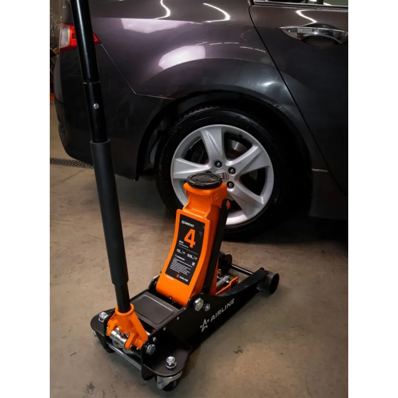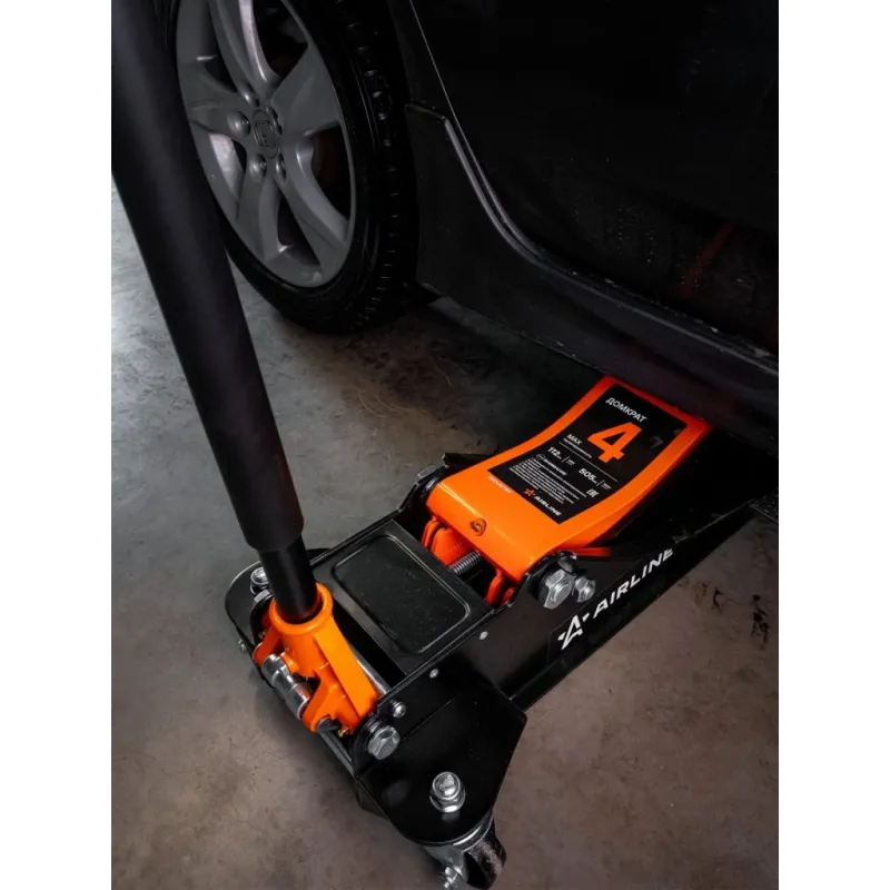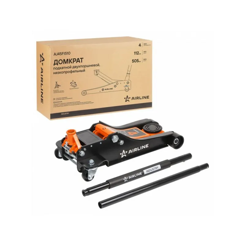 Домкрат подкатной 4т 112-505мм INDUSTRY двухпоршневой, низкопрофильный МП-серия Описание: Подкатной домкрат AIRLINE грузоподъемностью 4 т предназначен для подъема всех видов автомобилей массой до 5 т. Высота подхвата - 112 мм. Высота подъема - 505 мм. Домкрат входит в линейку INDUSTRY. Предназначен для профессионального применения в автосервисах и шиномонтажных мастерских, а так же для личного использования. Вес домкрата составляет 42 кг. Внушительный рабочий ресурс достигается за счет усиленной конструкции рамы, прочных внутренних механизмов, износостойких компонентов. Позволяют эксплуатировать домкрат при самых агрессивных нагрузках в течении длительного периода времени. Внутри насоса используется морозостойкое масло, которое сохраняет работоспособность при отрицательных температурах. Характеристики: Артикул: AJ45FI510 Грузоподъемность, т: 4 Высота подхвата, мм: 112 Высота подъема, мм: 505 Комплектация: Домкрат - 1 шт Рукоятка (2 части) - 1 шт Накладка на ручку домкрата - 1 шт Насадка на домкрат (резиновая) - 1 шт Паспорт изделия - 1 шт Гарантийный талон - 1 шт Коробка - 1 шт Гарантия: от 1 года.