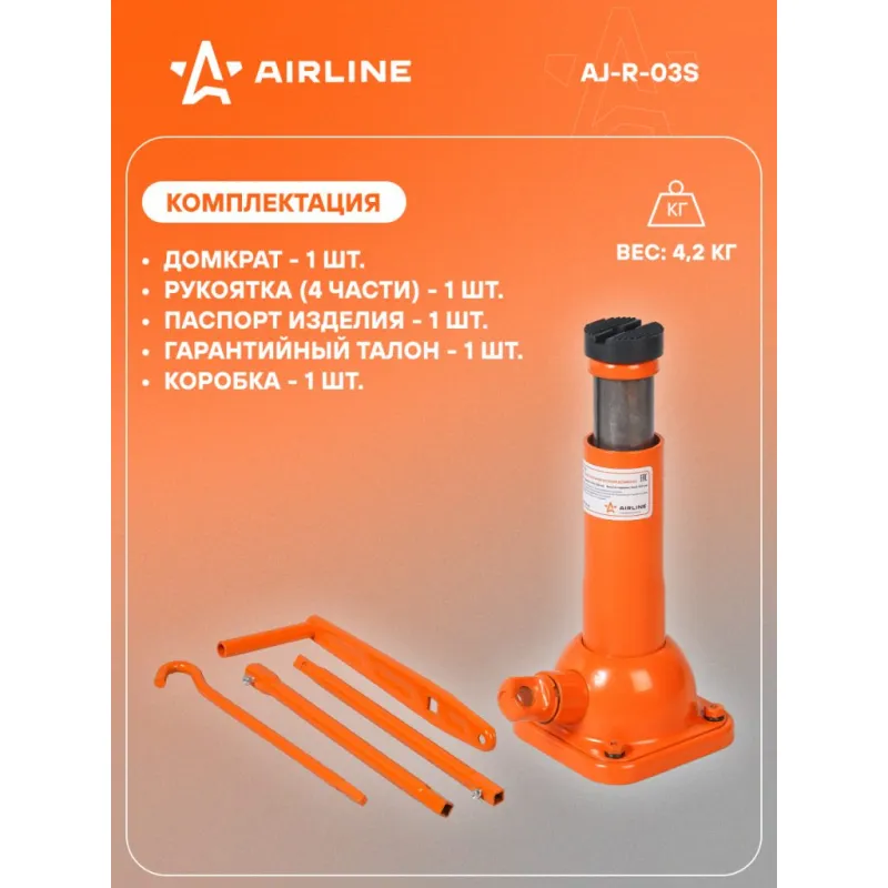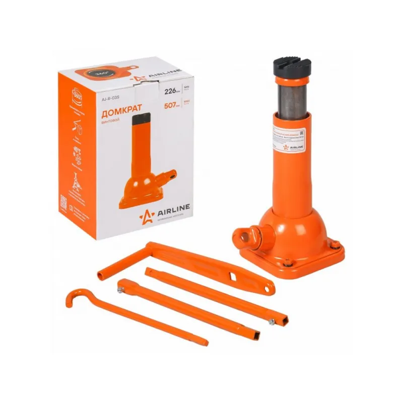 Домкрат винтовой 2т 226-507мм Описание: Домкрат автомобильный винтовой механический бренда AIRLINE- надежное устройство неприхотливое в обслуживании подойдет для подъема грузов и мебели, легковых машин, внедорожников и кроссоверов до 2 т. Грузоподъемность модели AJ-R-03S - 2 т. Домкрат винтовой позволяет поднять груз на высоту - 507 мм. Минимальная высота подхвата 226 мм. Особенности домкрата: высокая устойчивость, вращающаяся опорная площадка 360, рукоятка (4 части), морозостойкость -40С, прорезиненная площадка (седло). Благодаря своим небольшим габаритам может храниться в узком отсеке багажника и использоваться в полевых условиях. Достоинством домкрата AIRLINE является ручка разборной конструкции, которая помещается в упаковку с домкратом. 1. Запрещается превышать грузоподъемность домкрата! 2. Домкрат не должен использоваться в качестве подставки для поднятия грузов. 3. При подъеме груза убедитесь, что нагрузка приходится на центр опорной площадки. 4. Хранение автоинструментов может осуществляться в любом месте и положении. 5. Рекомендуется использовать страховочные подставки и противооткатные упоры. Надежный легкий подъемник маленького размера идеально дополнит ремонтный комплект автомобилиста и любой мужской набор инструментов и пригодится при замене деталей, колес и выполнить необходимые шиномонтажные работы. Автоаксессуар будет востребован не только в гараже, но и в профессиональной автомастерской, автомобильном салоне и на рабочей площадке. Благодаря компактности автотовар легко поместится в багажнике и может быть использован в дороге. В нашем магазине, вы найдете широкий ассортимент высококачественных автотоваров, автозапчастей, ремонтные комплекты, ремкоплекты резинок для домкрата, домкраты для машины подкатной, ромбический, реечный, телескопический, авто аксессуары для машины, автотовары для то, опоры и опорные стойки для домкрата, детали салона. Характеристики: Артикул: AJ-R-03S OEM номера: 12345678 Грузоподъемность, т: 2 Высота подхвата, мм: 226 Высота подъема, мм: 507 Комплектация: Домкрат - 1 шт Рукоятка (4 части) - 1 шт Паспорт изделия - 1 шт Гарантийный талон - 1 шт Коробка - 1 шт Гарантия: от 1 года.