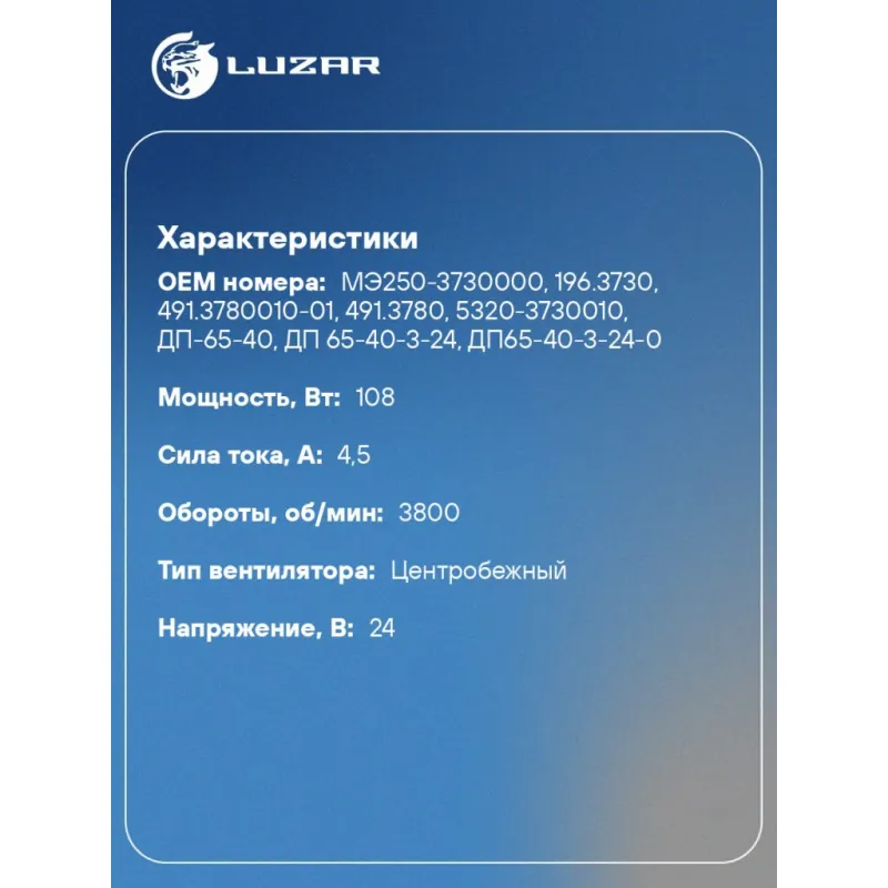 Электродвигатель вентилятора отопителя для автомобилей КАМАЗ (без крыльчатки, на шариковых подшипниках) Характеристики: Артикул: LFh 07196 OEM номера: МЭ250-3730000, 196.3730, 491.3780010-01, 491.3780, 5320-3730010, ДП-65-40, ДП 65-40-3-24, ДП65-40-3-24-0 Количество на автомобиль: 1 Диаметр крыльчатки, мм: - Обороты, об/мин: 3800 Напряжение, В: 24 Сила тока, А: 4,5 Высота крыльчатки, мм: - Мощность, Вт: 108 Кондиционер: - Конструкция: без крыльчатки Подходит для авто: КамаАЗ 5320, 5410, 5511, 6520, 6522, 4308, 4310, 4326, 5315, 53212, 54112, 55112, 55102, 55111, 4350, 5350, 6350, 6460, 65116, 65117, 65225 КрАЗ 6510, 6437, 643701, 6443, 64431, 6444, 6503, 65053, 65055 Для проверки применяемости отправьте VIN автомобиля через вкладку "Есть вопросы о товаре?" Комплектация: Электродвигатель вентилятора отопителя - 1 шт Паспорт изделия - 1 шт Гарантия: от 1 года.