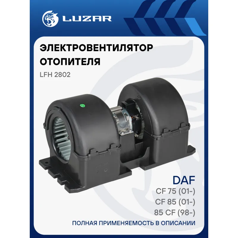 Электровентилятор отопителя для автомобилей DAF 85 CF (98-)/CF 85 (01-)/CF 75 (01-) (в корпусе) Характеристики: Артикул: LFh 2802 OEM номера: 1672500 Мощность, Вт: 348 Сила тока, А: 14,5 Обороты, об/мин: 3350 Тип вентилятора: центробежный Напряжение, В: 24 Количество на автомобиль: 1 Подходит для авто: DAF 75 CF (95-), 85 CF (95-), CF 75 (01-), CF 85 (01-), CF 85 (06-), 65 CF (98-), CF 65 (06-), CF 75 (06-), CF 65 (01-) Для проверки применяемости отправьте VIN автомобиля через вкладку "Есть вопросы о товаре?" Комплектация: Электровентилятор отопителя - 1 шт Паспорт изделия - 1 шт Гарантия: от 1 года.