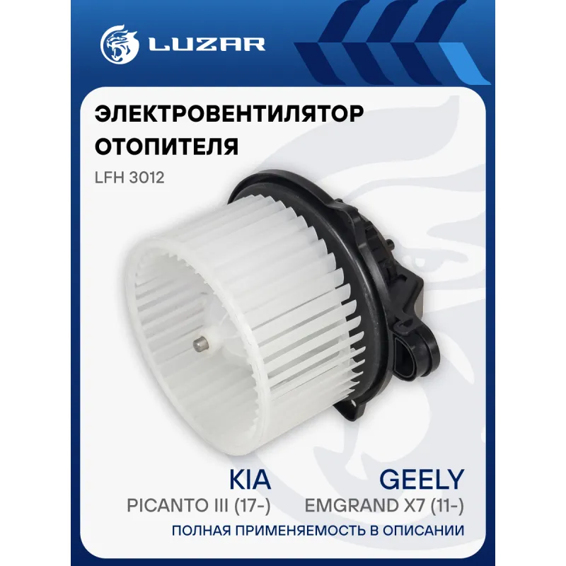 Электровентилятор отопителя для автомобилей Geely Emgrand X7 (11-)/KIA Picanto II (11-)/Picanto III (17-) Характеристики: Артикул: LFh 3012 OEM номера: 97111G6000, 971131Y000, 1017016542 Количество на автомобиль: 1 Диаметр крыльчатки, мм: 139,6 Обороты, об/мин: 3250 Напряжение, В: 12 Сила тока, А: 17,5 Тип вентилятора: центробежный Высота крыльчатки, мм: 74,8 Мощность, Вт: 210 Подходит для авто: Geely Emgrand X7 (13-) Kia Picanto (17-) Для проверки применяемости отправьте VIN автомобиля через вкладку "Есть вопросы о товаре?" Комплектация: Электровентилятор отопителя - 1 шт Паспорт изделия - 1 шт Гарантия: от 1 года.