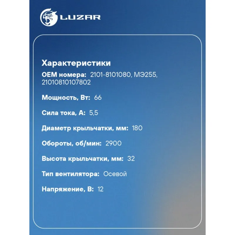 Электровентилятор отопителя для автомобилей Лада 2101-2107 (шарик. подшипники) Характеристики: Артикул: LFh 0101 OEM номера: 2101-8101080, МЭ255, 21010810107802 Количество на автомобиль: 1 Диаметр крыльчатки, мм: 180 Обороты, об/мин: 2900 Напряжение, В: 12 Сила тока, А: 5,5 Тип вентилятора: Осевой Высота крыльчатки, мм: 32 Мощность, Вт: 66 Подходит для авто: ВАЗ 1111 (Ока), 2101, 2102, 2103, 2106, 2104, 2105, 2107, 2107, 21053, 21073, 2104, 2131, 2131, 2120, 2121, 2121 SeAZ 11116 VIS 2345 Для проверки применяемости отправьте VIN автомобиля через вкладку "Есть вопросы о товаре?" Комплектация: Электровентилятор отопителя - 1 шт Уплотнительные подушки - 2 шт Скобы - 2 шт Паспорт изделия - 1 шт Гарантия: от 1 года.
