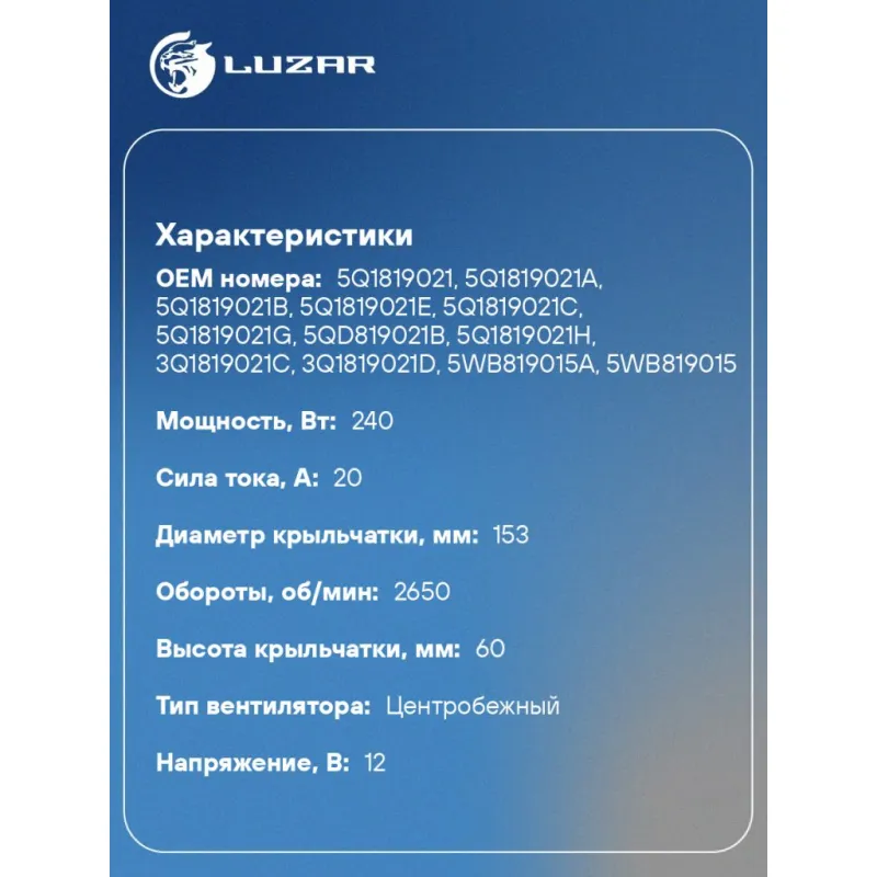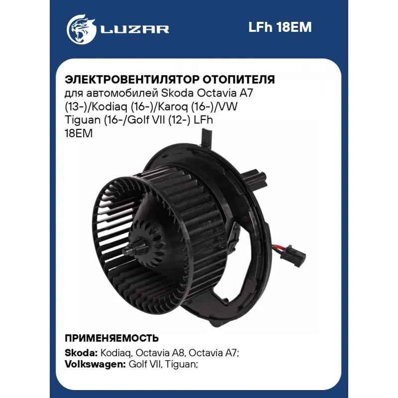 Электровентилятор отопителя для автомобилей Skoda Octavia A7 (13-)/Kodiaq (16-)/Karoq (16-)/VW Tiguan (16-/Golf VII (12-) Характеристики: Артикул: LFh 18EM OEM номера: 5Q1819021, 5Q1819021A, 5Q1819021B, 5Q1819021E, 5Q1819021C, 5Q1819021G, 5QD819021B, 5Q1819021H, 3Q1819021C, 3Q1819021D, 5WB819015A, 5WB819015, 5QL820021A Количество на автомобиль: 1 Диаметр крыльчатки, мм: 153 Обороты, об/мин: 2650 Напряжение, В: 12 Сила тока, А: 20 Тип вентилятора: центробежный Высота крыльчатки, мм: 60 Мощность, Вт: 240 Сопутствующий товар: Радиаторы отопителя: LRh 1851; LRh 1852 Сопутствующий товар: Резисторы нагрузочные: LFR 1820 Подходит для авто: Skoda Kodiaq (16-), Octavia A8 (20-), Octavia A7 (13-), Kodiaq (16-), Karoq (17-) Volkswagen Golf VII (12-), Tiguan (16-), Passat B8 (15-) Для проверки применяемости отправьте VIN автомобиля через вкладку "Есть вопросы о товаре?" Комплектация: Электровентилятор отопителя - 1 шт Паспорт изделия - 1 шт Гарантия: от 1 года.