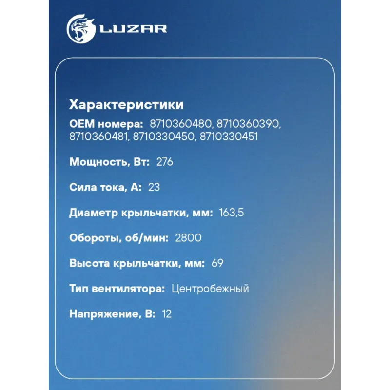 Электровентилятор отопителя для автомобилей Toyota Land Cruiser 200 (07-)/LX570 (07-) Характеристики: Артикул: LFh 1990 OEM номера: 8710360480, 8710360390, 8710360481, 8710330450, 8710330451 Количество на автомобиль: 1 Диаметр крыльчатки, мм: 163,5 Обороты, об/мин: 2800 Напряжение, В: 12 Сила тока, А: 23 Тип вентилятора: Центробежный Высота крыльчатки, мм: 69 Мощность, Вт: 276 Кондиционер: +/- Подходит для авто: Toyota Land Cruiser 200 (07-) Lexus LX 570 (07-), GS (05-), IS (05-) Для проверки применяемости отправьте VIN автомобиля через вкладку "Есть вопросы о товаре?" Комплектация: Паспорт изделия - 1 шт Электровентилятор отопителя - 1 шт Гарантия: от 1 года.