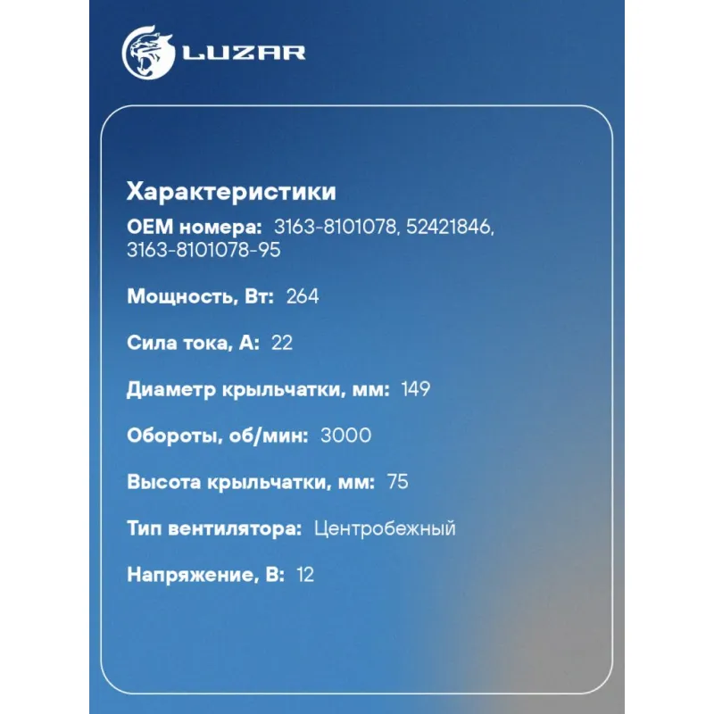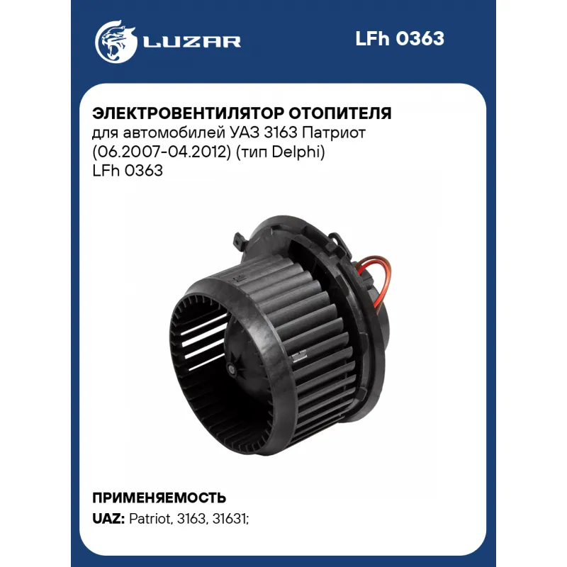 Электровентилятор отопителя для автомобилей УАЗ 3163 Патриот (06.2007-04.2012) (тип Delphi) Характеристики: Артикул: LFh 0363 OEM номера: 3163-8101078, 52421846, 3163-8101078-95 Количество на автомобиль: 1 Диаметр крыльчатки, мм: 149 Обороты, об/мин: 3000 Напряжение, В: 12 Сила тока, А: 22 Тип вентилятора: Центробежный Высота крыльчатки, мм: 75 Мощность, Вт: 264 Кондиционер: +/- Подходит для авто: УАЗ Patriot (08-), 3163 (Patriot) (05-), 31631, Patriot (08-) Для проверки применяемости отправьте VIN автомобиля через вкладку "Есть вопросы о товаре?" Комплектация: Паспорт изделия - 1 шт Электровентилятор отопителя - 1 шт Гарантия: от 1 года.