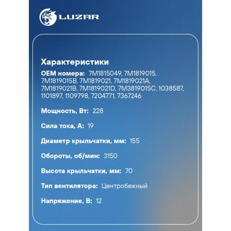 Электровентилятор отопителя для автомобилей VW Sharan (95-)/Ford Galaxy I (95-) Характеристики: Артикул: LFh 1828 OEM номера: 7M1815049, 7M1819015, 7M1819015B, 7M1819021, 7M1819021A, 7M1819021B, 7M1819021D, 7M3819015C, 1038587, 1101897, 1109798, 7204771, 7367246, 95NW18456AB, 95NW18456AC, 95NW18456AD, XM2H18456AA Мощность, Вт: 228 Сила тока, А: 19 Диаметр крыльчатки, мм: 155 Обороты, об/мин: 3150 Высота крыльчатки, мм: 70 Тип вентилятора: центробежный Напряжение, В: 12 Количество на автомобиль: 1 Подходит для авто: Ford Galaxy I (95-) Volkswagen Sharan (95-) Seat Alhambra (97-) Для проверки применяемости отправьте VIN автомобиля через вкладку "Есть вопросы о товаре?" Комплектация: Электровентилятор отопителя - 1 шт Паспорт изделия - 1 шт Гарантия: от 1 года.