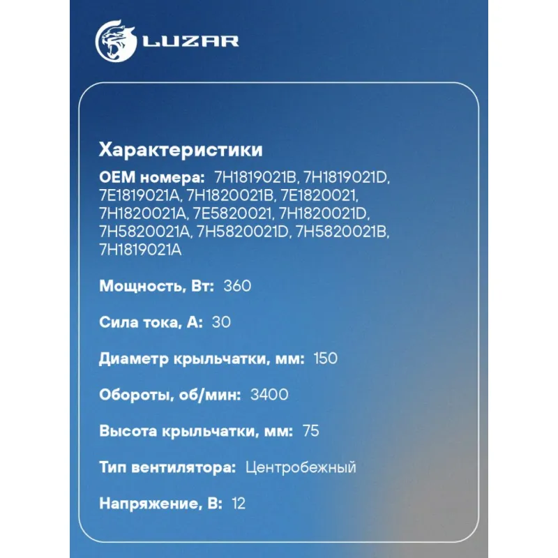 Электровентилятор отопителя для автомобилей VW Transporter T5 (03-) A/C± LFh 18H8 LUZAR