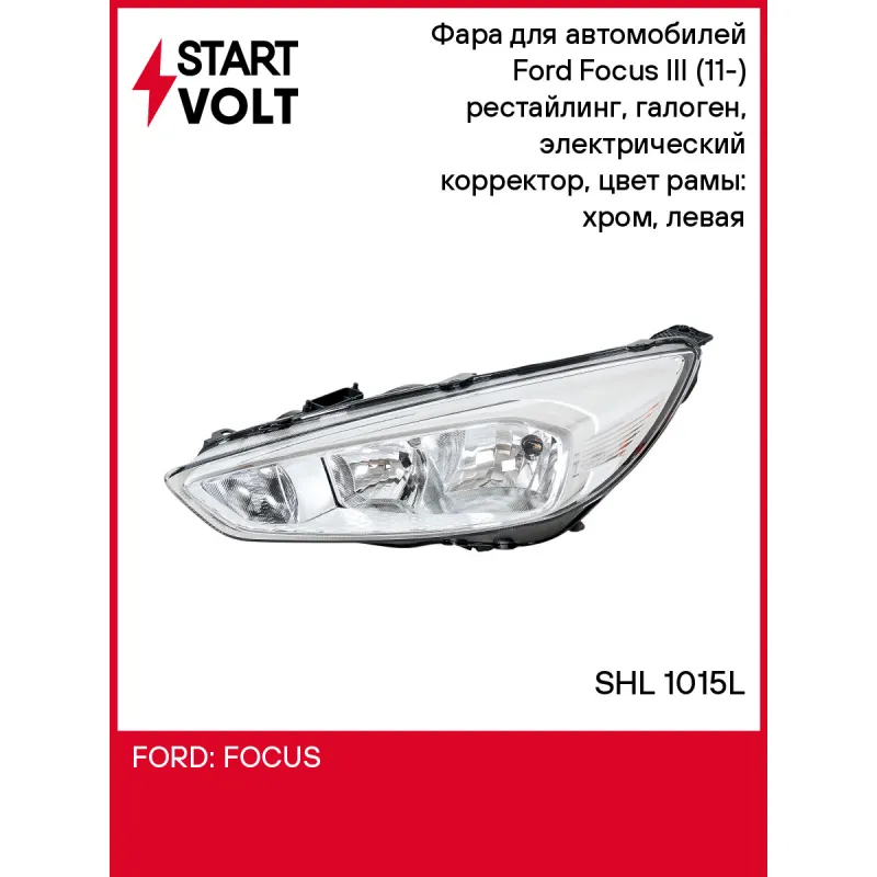 Фара для автомобилей Ford Focus III (11-) (головного света ) рестайлинг, галоген, электрический корректор, цвет рамы: хром, левая Характеристики: Артикул: SHL 1015L OEM номера: 1 939 294, 1866247, 2060612, F1EB13W030AEB, F1EB13W030NB Напряжение: 12В Сторона установки: слева Тип осветительного прибора: Галоген Тип лампы/ламп: H1/H7/PY21W/W5W Оснащение (корректор): Электрический Функция осветительного прибора (ДХО/без ДХО): без ДХО Количество на автомобиль: 1 Сторона движения: правостороннее Комплектация: Фара в сборе - 1 шт Паспорт изделия - 1 шт Гарантия: от 1 года.