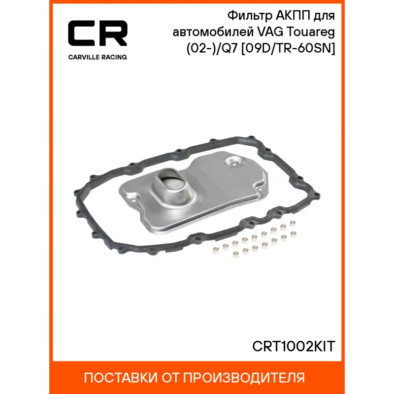 Фильтр АКПП для автомобилей VAG Touareg (02-)/Q7 (05-) [09D/TR-60SN] Характеристики: Артикул: CRT1002KIT OEM номера: 955.307.40301, 95530740300, 09D-325-429, 09D 325 435, 09D321371 Ширина, мм: 180 Длина, мм: 275 Высота, мм: 69 акпп: 09D (TR-60SN) Количество на автомобиль: 1 Комплектация: Фильтр АКПП - 1 шт Прокладка - 1 шт Дистанционные втулки - 16 шт Уплотнительное кольцо - 1 шт Гарантия: от 1 года.