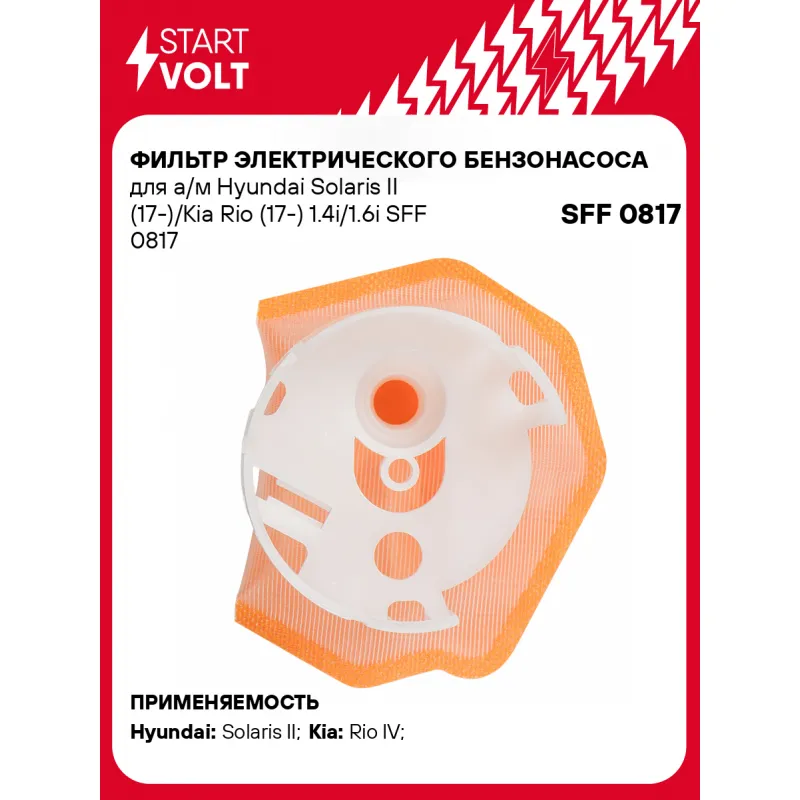 Фильтр электрического бензонасоса для а/м Hyundai Solaris II (17-)/Kia Rio (17-) 1.4i/1.6i Описание: Фильтр (сетка) электрического бензонасоса для автомобилей HYUNDAI SOLARIS, KIA RIO.. Сетчатый фильтр – применяется в модулях погружных электробензонасосов автомобильных двигателей с системой впрыска топлива. Предназначен для предварительной очистки топлива от сорных частиц и прочих загрязнений. Эффективная защита топливного насоса и форсунки от засорения. Фильтр грубой очистки состоит из пластикового каркаса с соединительным патрубком и сетчатого материала, натянутого на каркас. Если у вас есть вопросы по применяемости, мы всегда готовы помочь вам с подбором по VIN-НОМЕРУ ВАШЕГО АВТОМОБИЛЯ. Характеристики: Артикул: SFF 0817 OEM номера: 31120-H5000, 31119-C9000 Ширина, мм: 67 Длина, мм: 76 Количество на автомобиль: 1 Подходит для авто: Hyundai Solaris II (17-) Kia Rio IV (17-), Rio IV (17-) Для проверки применяемости отправьте VIN автомобиля через вкладку "Есть вопросы о товаре?" Комплектация: Соединительное кольцо - 1 шт Фильтр-сетка - 1 шт Гарантия: от 1 года.
