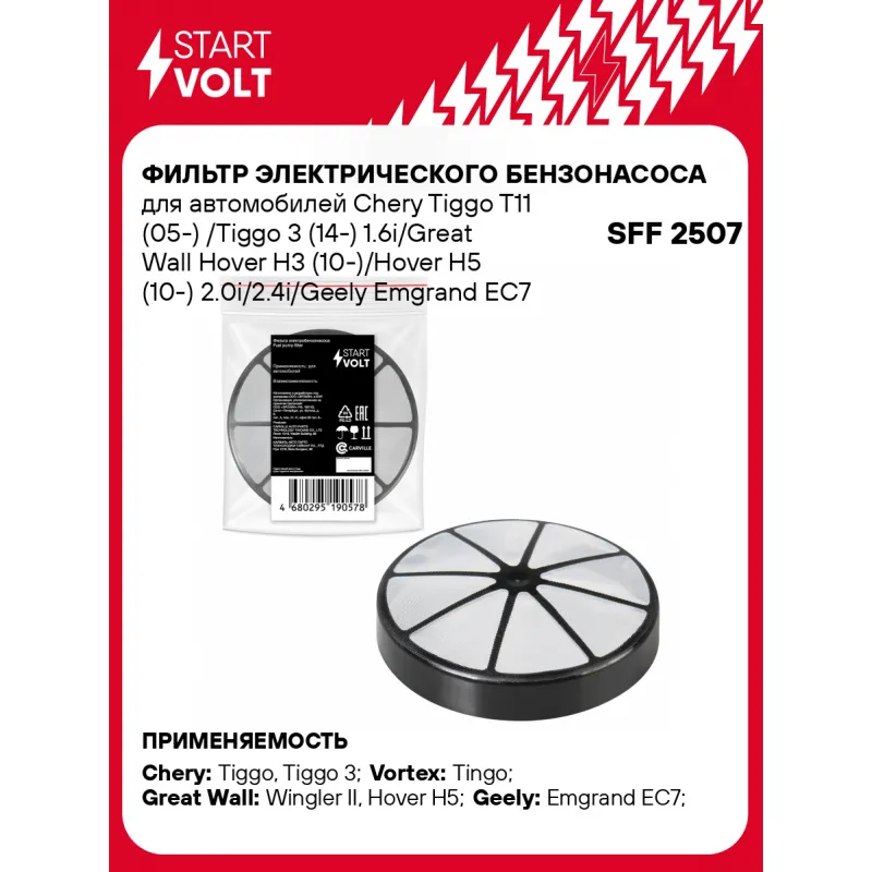 Фильтр электрического бензонасоса для автомобилей Chery Tiggo T11 (05-) /Tiggo 3 (14-) 1.6i/Great Wall Hover H3 (10-)/Hover H5 (10-) 2.0i/2.4i/Geely Emgrand EC7 (09-) 1.8i Описание: Фильтр (сетка) электрического бензонасоса для автомобилей CHERY TIGGO, TIGGO 3, EMGRAND EC7, GEELY EMGRAND EC7/7, GREAT WALL HOVER H3, HOVER H5, WINGLE, VORTEX TINGO.. Сетчатый фильтр – применяется в модулях погружных электробензонасосов автомобильных двигателей с системой впрыска топлива. Предназначен для предварительной очистки топлива от сорных частиц и прочих загрязнений. Эффективная защита топливного насоса и форсунки от засорения. Фильтр грубой очистки состоит из пластикового каркаса с соединительным патрубком и сетчатого материала, натянутого на каркас. Если у вас есть вопросы по применяемости, мы всегда готовы помочь вам с подбором по VIN-НОМЕРУ ВАШЕГО АВТОМОБИЛЯ. Характеристики: Артикул: SFF 2507 OEM номера: T111106610DD, T11-1106010, T11-1106610DA, 1106100K00 Ширина, мм: 69 Длина, мм: 69 Количество на автомобиль: 1 Подходит для авто: Chery Tiggo (T11) (06-), Tiggo 3 (16-) Vortex Tingo (10-) Great Wall Wingler II (11-), Hover H5 (11-), Hover H3 I (10-) Geely Emgrand EC7 (09-) Для проверки применяемости отправьте VIN автомобиля через вкладку "Есть вопросы о товаре?" Комплектация: Фильтр-сетка топливный - 1 шт Гарантия: от 1 года.