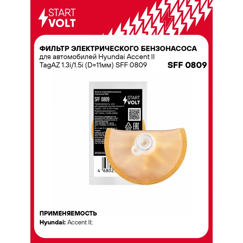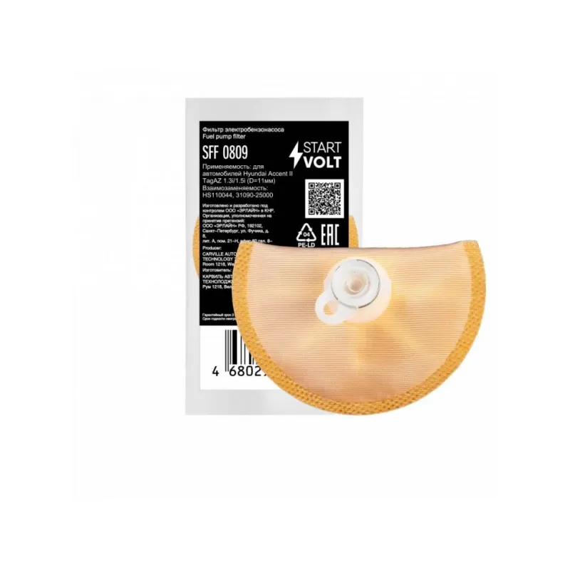 Фильтр электрического бензонасоса для автомобилей Hyundai Accent II TagAZ 1.3i/1.5i (D=11мм) Описание: Фильтр (сетка) электрического бензонасоса для автомобилей HYUNDAI ACCENT.. Сетчатый фильтр – применяется в модулях погружных электробензонасосов автомобильных двигателей с системой впрыска топлива. Предназначен для предварительной очистки топлива от сорных частиц и прочих загрязнений. Эффективная защита топливного насоса и форсунки от засорения. Фильтр грубой очистки состоит из пластикового каркаса с соединительным патрубком и сетчатого материала, натянутого на каркас. Если у вас есть вопросы по применяемости, мы всегда готовы помочь вам с подбором по VIN-НОМЕРУ ВАШЕГО АВТОМОБИЛЯ. Характеристики: Артикул: SFF 0809 OEM номера: HS110044, 31090-25000, 31090-22040, 31090-25800 Количество на автомобиль: 1 Тип: Сетчатый фильтр Длина, мм: 82 Ширина, мм: 54 Диаметр, мм: 11 Подходит для авто: Hyundai Accent II (TagAZ) (01-), Accent II (99-) Для проверки применяемости отправьте VIN автомобиля через вкладку "Есть вопросы о товаре?" Комплектация: Соединительное кольцо - 1 шт Фильтр-сетка - 1 шт Гарантия: от 1 года.