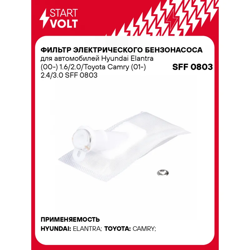 Фильтр электрического бензонасоса для автомобилей Hyundai Elantra (00-) 1.6/2.0/Toyota Camry (01-) 2.4/3.0 Описание: Фильтр (сетка) электрического бензонасоса для автомобилей HYUNDAI ELANTRA, TOYOTA CAMRY.. Сетчатый фильтр – применяется в модулях погружных электробензонасосов автомобильных двигателей с системой впрыска топлива. Предназначен для предварительной очистки топлива от сорных частиц и прочих загрязнений. Эффективная защита топливного насоса и форсунки от засорения. Фильтр грубой очистки состоит из пластикового каркаса с соединительным патрубком и сетчатого материала, натянутого на каркас. Если у вас есть вопросы по применяемости, мы всегда готовы помочь вам с подбором по VIN-НОМЕРУ ВАШЕГО АВТОМОБИЛЯ. Характеристики: Артикул: SFF 0803 OEM номера: 8971632481, 8971632480, MR 134804, MR 124765, MR 134868, 97118512, 1510080C02, 1510080C01, 31112-28100, 31111-37300, 31110-33610, 31111 28300, 31111 37200, 23217-46080, HS110007 Количество на автомобиль: 1 Тип: Сетчатый фильтр Длина, мм: 85 Ширина, мм: 44 Диаметр, мм: 11 Комплектация: Соединительное кольцо - 1 шт Фильтр-сетка - 1 шт Гарантия: от 1 года.