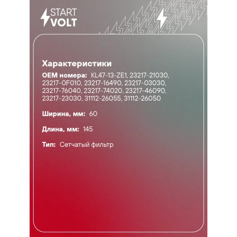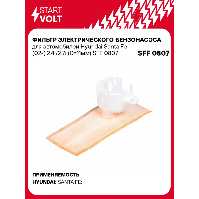 Фильтр электрического бензонасоса для автомобилей Hyundai Santa Fe (02-) 2.4i/2.7i (D=11мм) Описание: Фильтр (сетка) электрического бензонасоса для автомобилей HYUNDAI SANTA FE.. Сетчатый фильтр – применяется в модулях погружных электробензонасосов автомобильных двигателей с системой впрыска топлива. Предназначен для предварительной очистки топлива от сорных частиц и прочих загрязнений. Эффективная защита топливного насоса и форсунки от засорения. Фильтр грубой очистки состоит из пластикового каркаса с соединительным патрубком и сетчатого материала, натянутого на каркас. Если у вас есть вопросы по применяемости, мы всегда готовы помочь вам с подбором по VIN-НОМЕРУ ВАШЕГО АВТОМОБИЛЯ. Характеристики: Артикул: SFF 0807 OEM номера: KL47-13-ZE1, 23217-21030, 23217-0F010, 23217-16490, 23217-03030, 23217-76040, 23217-74020, 23217-46090, 23217-23030, 31112-26055, 31112-26050, HS110049 Количество на автомобиль: 1 Тип: Сетчатый фильтр Длина, мм: 145 Ширина, мм: 60 Диаметр, мм: 11 Комплектация: Фильтр-сетка - 1 шт Соединительное кольцо - 1 шт Гарантия: от 1 года.