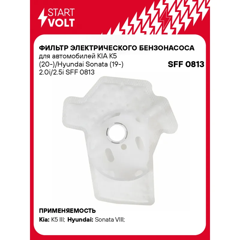 Фильтр электрического бензонасоса для автомобилей KIA K5 (20-)/Hyundai Sonata (19-) 2.0i/2.5i Описание: Фильтр (сетка) электрического бензонасоса для автомобилей HYUNDAI SONATA, TUCSON, KIA OPTIMA.. Сетчатый фильтр – применяется в модулях погружных электробензонасосов автомобильных двигателей с системой впрыска топлива. Предназначен для предварительной очистки топлива от сорных частиц и прочих загрязнений. Эффективная защита топливного насоса и форсунки от засорения. Фильтр грубой очистки состоит из пластикового каркаса с соединительным патрубком и сетчатого материала, натянутого на каркас. Если у вас есть вопросы по применяемости, мы всегда готовы помочь вам с подбором по VIN-НОМЕРУ ВАШЕГО АВТОМОБИЛЯ. Характеристики: Артикул: SFF 0813 OEM номера: 31120L1600, 31120L2700 Ширина, мм: 90 Длина, мм: 99 Количество на автомобиль: 1 Подходит для авто: Kia K5 III (20-) Hyundai Sonata VIII (19-) Для проверки применяемости отправьте VIN автомобиля через вкладку "Есть вопросы о товаре?" Комплектация: Фильтр-сетка - 1 шт Паспорт изделия/гарантийный талон - 1 шт Гарантия: от 1 года.