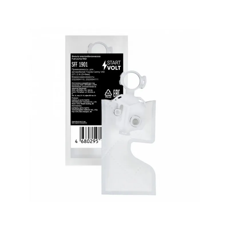 Фильтр электрического бензонасоса для автомобилей Toyota Camry V40 (07-) 2.4i (D=9мм) Описание: Фильтр (сетка) электрического бензонасоса для автомобилей TOYOTA CAMRY.. Сетчатый фильтр – применяется в модулях погружных электробензонасосов автомобильных двигателей с системой впрыска топлива. Предназначен для предварительной очистки топлива от сорных частиц и прочих загрязнений. Эффективная защита топливного насоса и форсунки от засорения. Фильтр грубой очистки состоит из пластикового каркаса с соединительным патрубком и сетчатого материала, натянутого на каркас. Если у вас есть вопросы по применяемости, мы всегда готовы помочь вам с подбором по VIN-НОМЕРУ ВАШЕГО АВТОМОБИЛЯ. Характеристики: Артикул: SFF 1901 OEM номера: 232200H110, 232200H111, 2322028070, 2322028071, HS090010 Количество на автомобиль: 1 Тип: Сетчатый фильтр Длина, мм: 110 Ширина, мм: 62 Диаметр, мм: 9 Комплектация: Фильтр-сетка - 1 шт Гарантия: от 1 года.