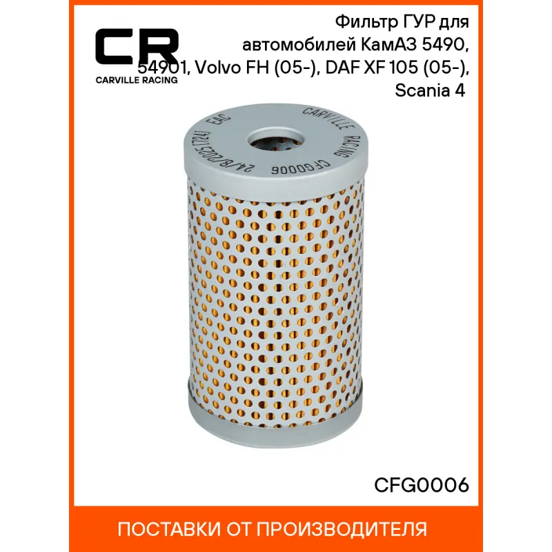Фильтр ГУР для автомобилей КамАЗ 5490, 54901, Volvo FH (05-), DAF XF 105 (05-), Scania 4 (95-) Характеристики: Артикул: CFG0006 OEM номера: 022 9348, 229 348, 2027059, 190 2137, 81.47301-6005, 153 468, 21392404, 705.1012040 Внутренний диаметр, мм: 18 Высота, мм: 99,7 Наружный диаметр, мм: 59,5 Исполнение фильтра: Фильтр-патрон ... Читать полностью →
