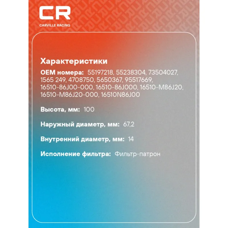 Фильтр масляный для автомобилей Opel Astra H (04-)/Corsa D (06-)/Fiat Dolbo (05-) 1.3D Характеристики: Артикул: CRLR7127X OEM номера: 55197218, 55238304, 73504027, 1565 249, 4708750, 5650367, 95517669, 16510-86J00-000, 16510-86J000, 16510-M86J20, 16510-M86J20-000, 16510N86J00, 16510N86J00000, 16511-85E10, 16511-85E10-000, 93186856, 93193573 Внутренний диаметр, мм: 14 Высота, мм: 100 Наружный диаметр, мм: 67,2 Исполнение фильтра: Фильтр-патрон Количество на автомобиль: 1 Комплектация: Кольцо уплотнительное - 1 шт Фильтр масляный - 1 шт Гарантия: от 1 года.