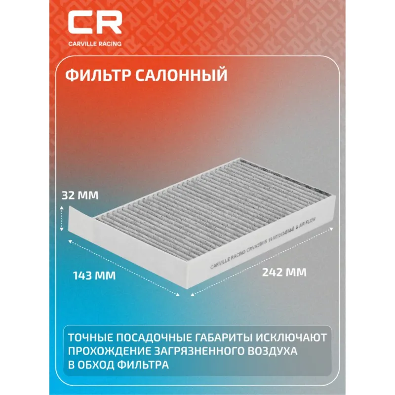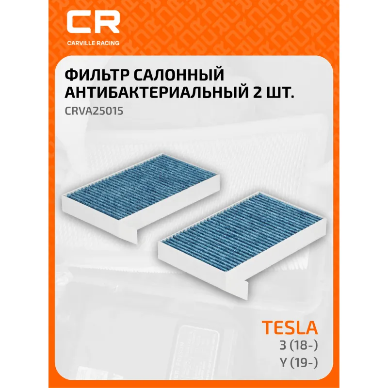 Фильтр салонный антибактериальный для автомобилей Tesla 3 (18-)/Y (19-) 2шт. Описание: Салонные фильтры CRVA25015 бренда CARVILLE RACING обеспечивают подачу очищенного воздуха в салон автомобиля, эффективно защищают водителя и пассажиров от воздействия пыли, сажи, смога, пыльцы и других дорожных загрязнений. Антибактериальные фильтры с дополнительной защитой от бактерий, аллергенов и вирусов. Подбор по VIN-номеру вашего автомобиля - через кнопку 'Задать вопрос'. Специалист проверит применяемость и ответит вам. Применяемость TESLA MODEL 3, MODEL Y.. Производство фильтров осуществляется на высокотехнологичных автоматизированных линиях, сертифицированных стандартом IATF 16949:2016. Вся продукция испытывается в испытательных лабораториях, аккредитованных стандартами по ISO 17025: 2017 и CNAS-CL01. Большое количество складок и большая площадь фильтрации обеспечивают фильтрацию мельчайших загрязнений и большую грязеемкость для длительного срока службы. Устойчивы к воздействию влаги и перепаду температур, предотвращают запотевание окон. Точные посадочные габариты исключают прохождение воздуха в обход фильтра. Характеристики: Артикул: CRVA25015 OEM номера: 1107681-00-A, 1107681-00-B Ширина, мм: 143 Длина, мм: 242 Высота, мм: 32 Количество в комплекте, шт: 2 Исполнение фильтра: Антибактериальный Комплект: Комплект Количество на автомобиль: 1 Комплектация: Фильтр салонный антибактериальный - 2 шт Гарантия: от 1 года.