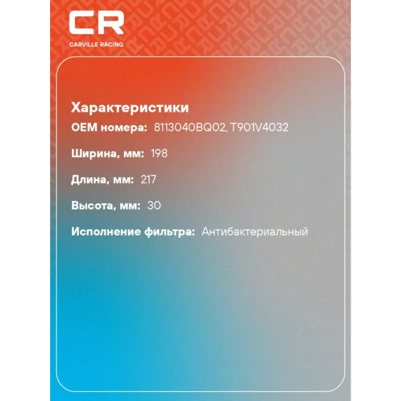 Фильтр салонный антибактериальный для автомобилей FAW Bestune T99 (19-) Описание: Фильтр салонный для автомобилей, антибактериальный фильтр CARVILLE RACING CRVA55002 Салонные фильтры обеспечивают подачу очищенного воздуха в салон автомобиля, эффективно защищают водителя и пассажиров от воздействия пыли, сажи, смога, пыльцы и других дорожных загрязнений. Большое количество складок и большая площадь фильтрации обеспечивают фильтрацию мельчайших загрязнений и большую грязеемкость для длительного срока службы. Устойчивы к воздействию влаги и перепаду температур, предотвращают запотевание окон. Точные посадочные габариты исключают прохождение воздуха в обход фильтра. Антибактериальные фильтры с дополнительной защитой от бактерий, аллергенов и вирусов. Применяемость BESTUNE T99. Чтобы убедиться, что деталь подойдет на Ваш автомобиль, пожалуйста, отправьте через кнопку 'Задать вопрос' нам сообщение с VIN-номером вашего автомобиля. Производство фильтров осуществляется на высокотехнологичных автоматизированных линиях, сертифицированных стандартом IATF 16949:2016. Вся продукция испытывается в испытательных лабораториях, аккредитованных стандартами по ISO 17025: 2017 и CNAS-CL01. В нашем магазине, вы найдете широкий ассортимент высококачественных автотоваров, автозапчастей, ремонтные комплекты авто аксессуары, электрооборудование, автогаджеты и девайсы, фильтры и многое другое. Мы гарантируем качество и надежность наших товаров. Характеристики: Артикул: CRVA55002 OEM номера: 8113040BQ02, T901V4032 Ширина, мм: 198 Длина, мм: 217 Высота, мм: 30 Исполнение фильтра: Антибактериальный Количество на автомобиль: 1 Комплектация: Фильтр салонный антибактериальный - 1 шт Гарантия: от 1 года.