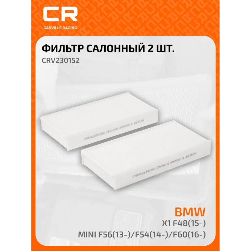 Фильтр салонный для автомобилей BMW X1 F48 (14-)/Mini F56 (13-)/F54 (14-)/F60(16-) Описание: Фильтр салонный для автомобилей BMW (2 X1 i3) Mini / БМВ, Мини, частичный пылевой фильтр CARVILLE RACING CRV230152 Салонные фильтры обеспечивают подачу очищенного воздуха в салон автомобиля, эффективно защищают водителя и пассажиров от воздействия пыли, сажи, смога, пыльцы и других дорожных загрязнений. Большое количество складок и большая площадь фильтрации обеспечивают фильтрацию мельчайших загрязнений и большую грязеемкость для длительного срока службы. Устойчивы к воздействию влаги и перепаду температур, предотвращают запотевание окон. Применяемость BMW i3, X1, 2, 1, X2, MINI MINI, MINI CLUBMAN, MINI COUNTRYMAN. Чтобы убедиться, что деталь подойдет на Ваш автомобиль, пожалуйста, отправьте через кнопку 'Задать вопрос' нам сообщение с VIN-номером вашего автомобиля. Точные посадочные габариты исключают прохождение воздуха в обход фильтра. Вся продукция подвергается испытаниям в специализированных лабораториях, аккредитованных стандартами с ISO 17025: 2017 и CNAS-CL01. В нашем магазине, вы найдете широкий ассортимент высококачественных автотоваров, автозапчастей, ремонтные комплекты авто аксессуары, электрооборудование, автогаджеты и девайсы, фильтры и многое другое. Мы гарантируем качество и надежность наших товаров. Характеристики: Артикул: CRV230152 OEM номера: 64 11 6 835 404, 64316835404, 64316835405 Ширина, мм: 115 Длина, мм: 233 Высота, мм: 32 Исполнение фильтра: Частичный фильтр Количество на автомобиль: 1 Комплектация: Фильтр салонный - 2 шт Гарантия: от 1 года.
