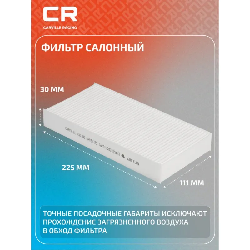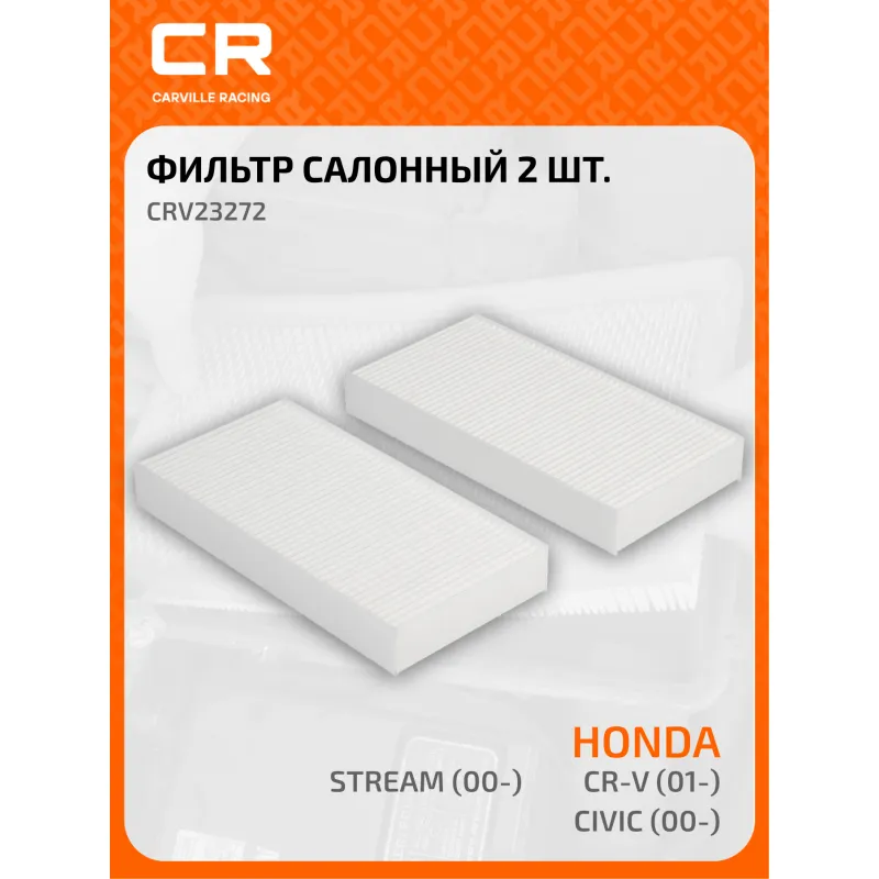 Фильтр салонный для автомобилей Honda CR-V (01-)/Civic (00-)/Stream (00-) 2шт. Описание: Фильтр салонный для автомобилей 2 шт Honda (Civic, CR-V, FR-V, Stream) / Хонда (ЦР-В, Цивик, ФР-В, Стрим), частичный пылевой фильтр CARVILLE RACING CRV23272 Салонные фильтры обеспечивают подачу очищенного воздуха в салон автомобиля, эффективно защищают водителя и пассажиров от воздействия пыли, сажи, смога, пыльцы и других дорожных загрязнений. Большое количество складок и большая площадь фильтрации обеспечивают фильтрацию мельчайших загрязнений и большую грязеемкость для длительного срока службы. Устойчивы к воздействию влаги и перепаду температур, предотвращают запотевание окон. Применяемость HONDA STREAM, FR-V, CR-V, CIVIC, INTEGRA, CROSSROAD. Чтобы убедиться, что деталь подойдет на Ваш автомобиль, пожалуйста, отправьте через кнопку 'Задать вопрос' нам сообщение с VIN-номером вашего автомобиля. Точные посадочные габариты исключают прохождение воздуха в обход фильтра. Вся продукция подвергается испытаниям в специализированных лабораториях, аккредитованных стандартами с ISO 17025: 2017 и CNAS-CL01. В нашем магазине, вы найдете широкий ассортимент высококачественных автотоваров, автозапчастей, ремонтные комплекты авто аксессуары, электрооборудование, автогаджеты и девайсы, фильтры и многое другое. Мы гарантируем качество и надежность наших товаров. Характеристики: Артикул: CRV23272 OEM номера: 80292-S5A-003, 80292-SCA-E11, 08R79-S5A-600, 80292-S50-A01, 80292-S5D-406, 80292-S5D-416, 80292-S5D-A01, 80292-S6D-G01, 80292-S6M-901, 80292-SCA-G01 Ширина, мм: 111 Длина, мм: 225 Высота, мм: 30 Количество в комплекте, шт: 2 Исполнение фильтра: Частичный фильтр Комплект: Да Количество на автомобиль: 1 Комплектация: Фильтр салонный - 2 шт Гарантия: от 1 года.